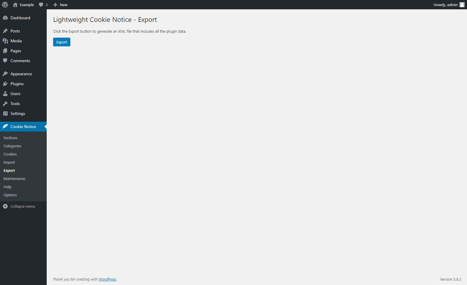 The import and export feature available in Lightweight Cookie Notice allows you to archive the plugin data as XML files, so you can quickly move a perfectly configured cookie notice between websites.
