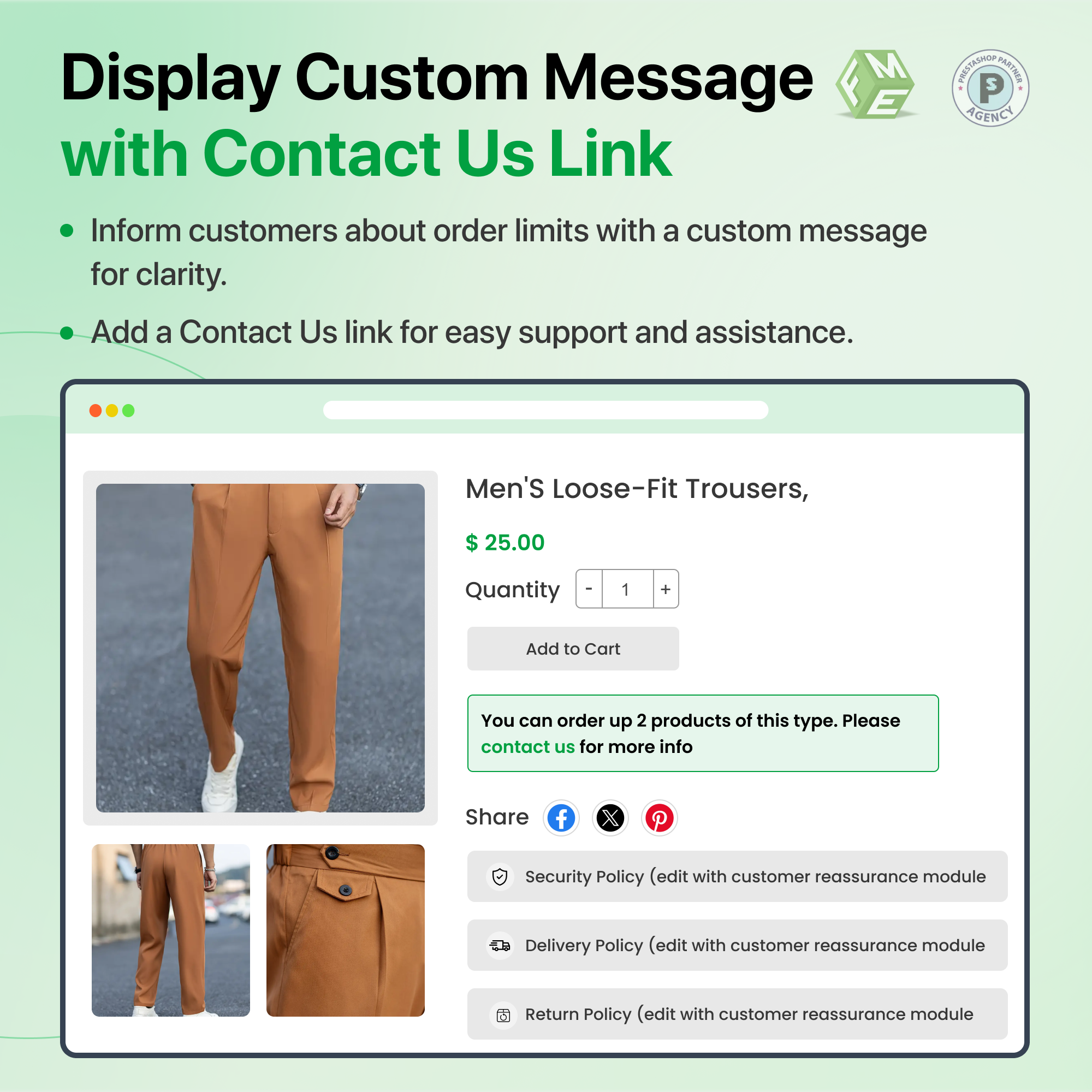 Модуль Prestashop Limit Order Quantity предоставляет владельцам магазинов Prestashop возможность устанавливать ограничения на количество продуктов, которые покупатели могут приобрести или добавить в свои корзины. Внедряя количественные ограничения, основанные на минимальном и максимальном количестве, владельцы магазинов могут запретить покупателям заказывать или добавлять чрезмерное количество товаров.