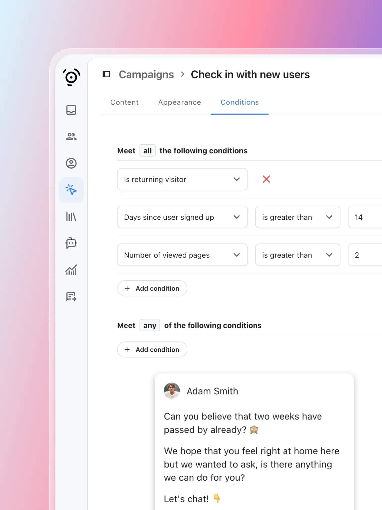 Campaign conditions – Define when campaigns and to whom campaigns should be shown based on various conditions.
