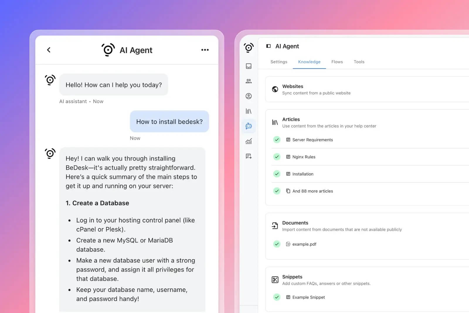 Integration with AI agent – Full integration with BeDesk AI agent for instant support to customers based on knowledge sources.