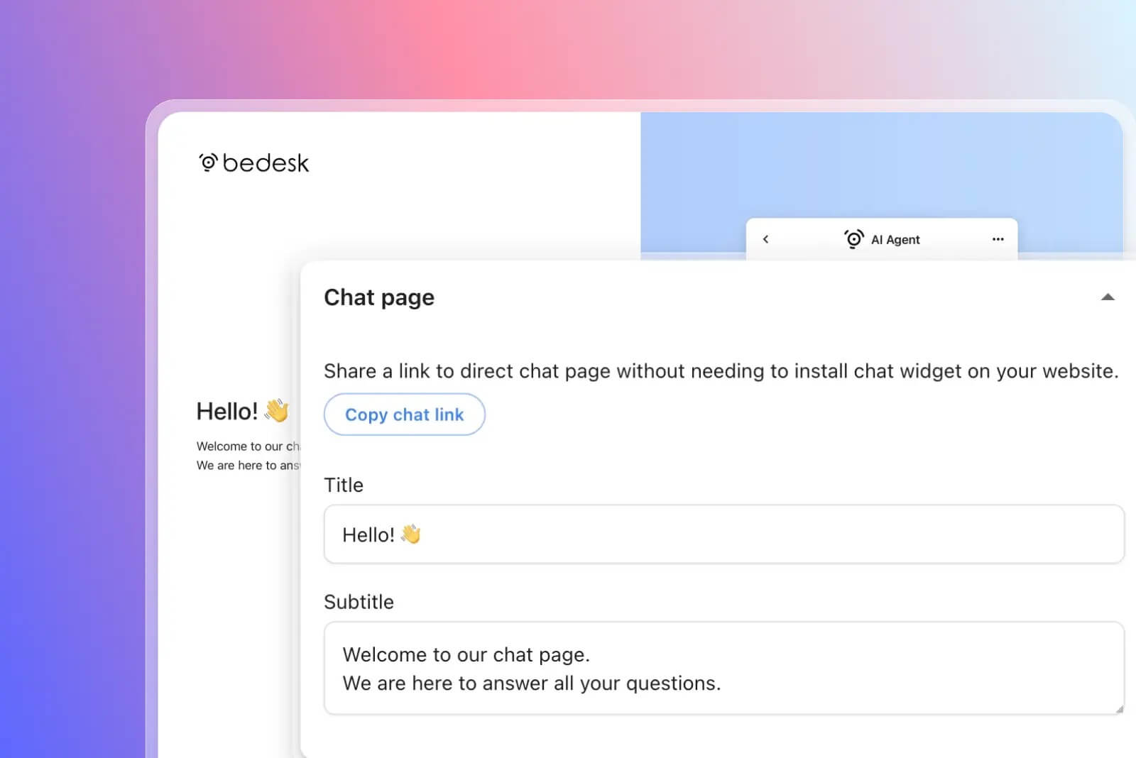 Chat page – Share a direct link to a dedicated, standalone chat page in emails or on social media, without needing to embed the widget on your site.