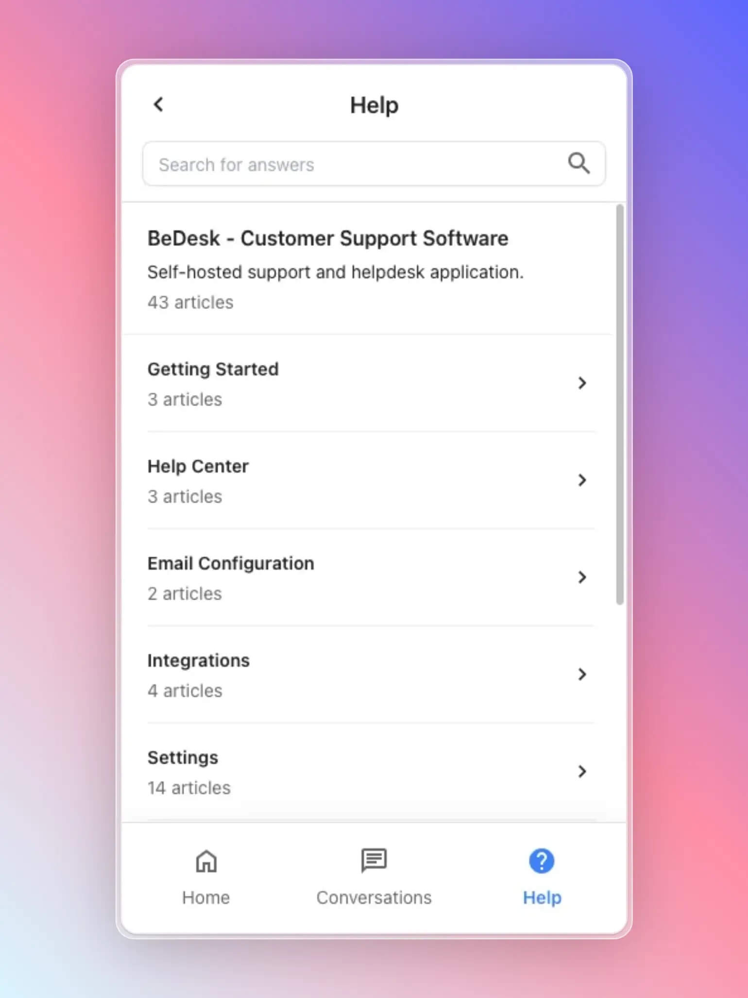 Help center screen – Fully integrated BeDesk help center with articles and categories.
