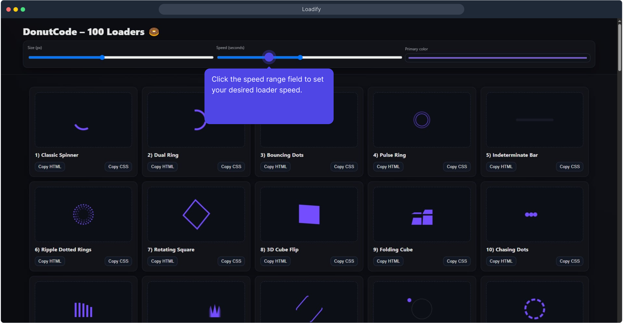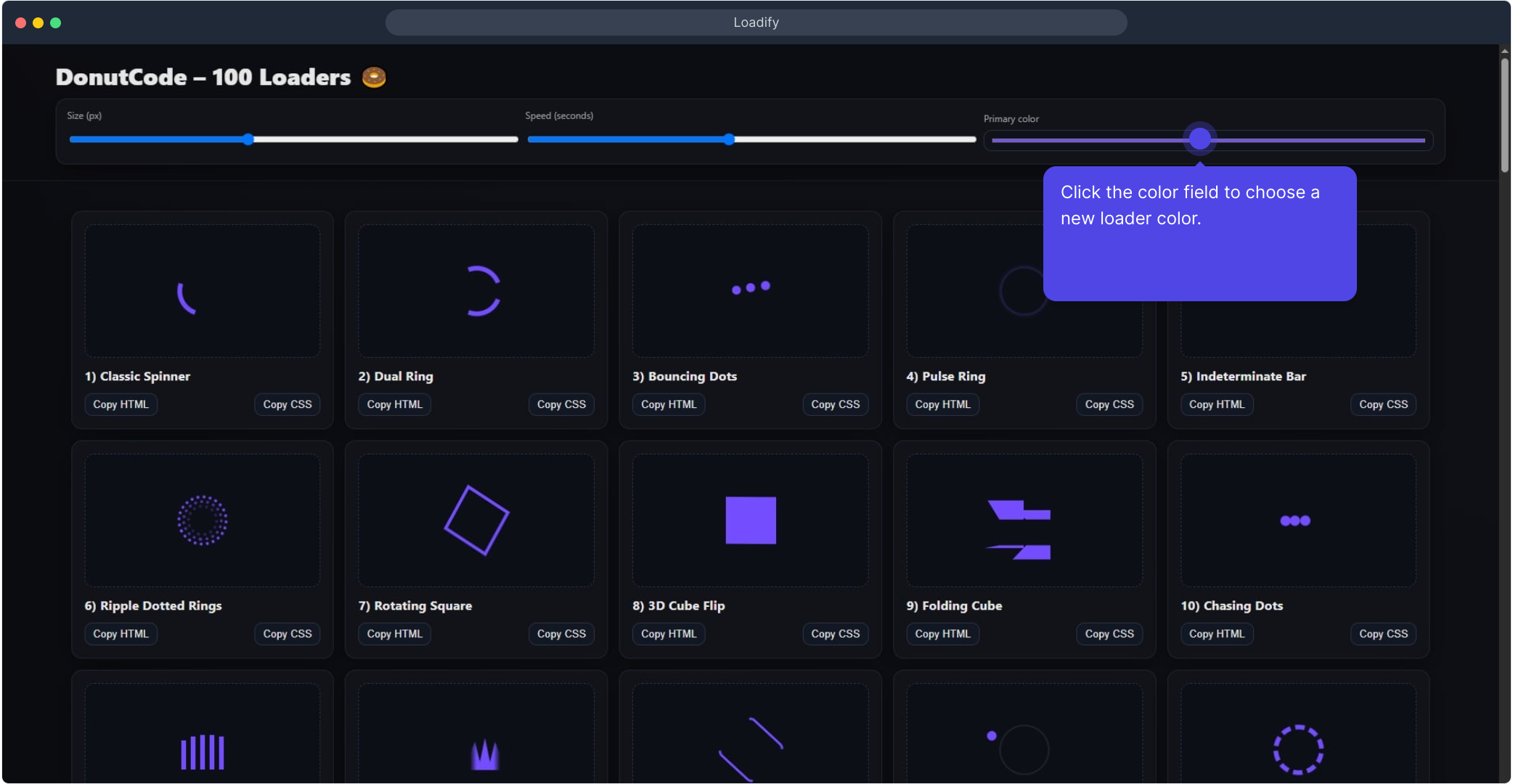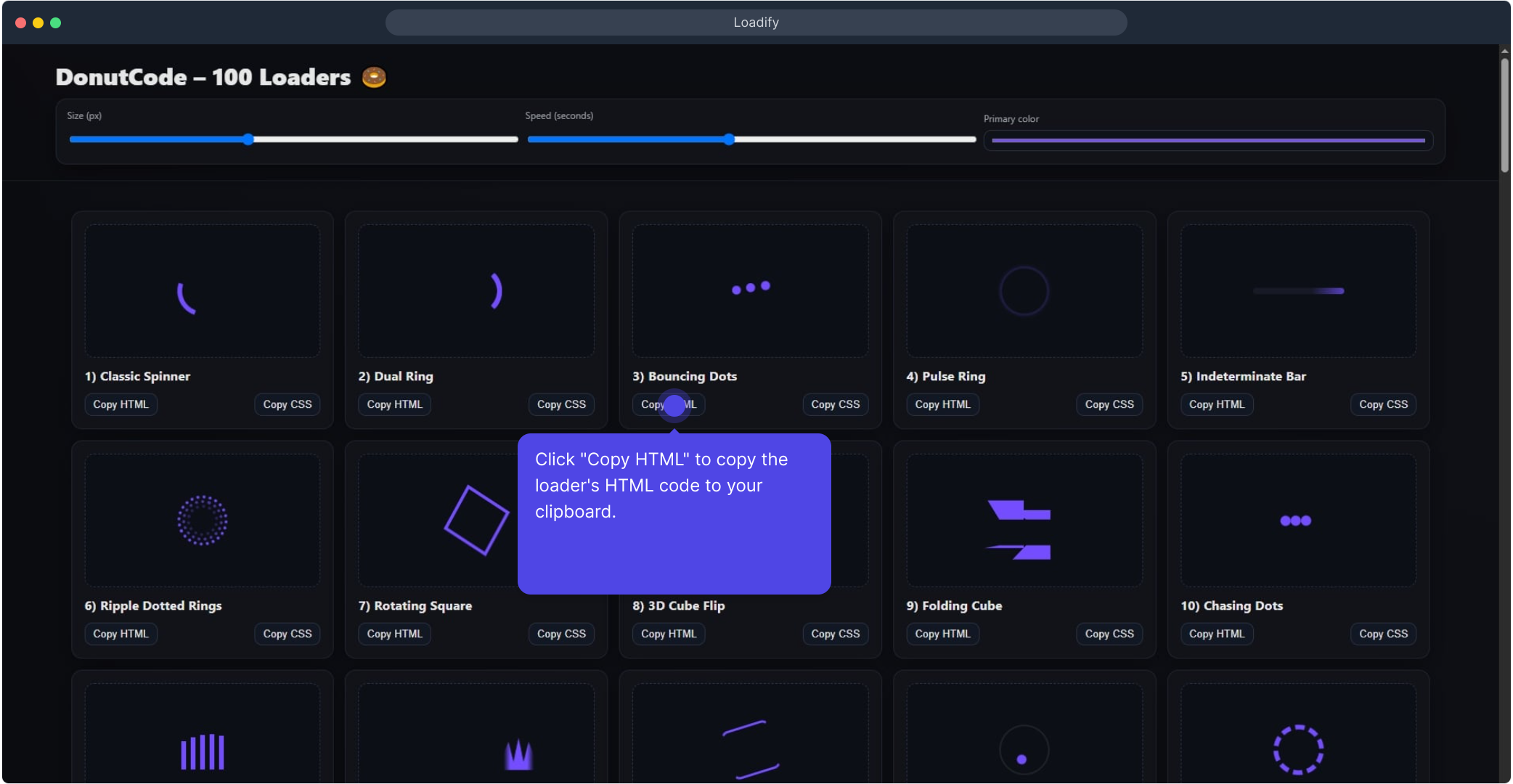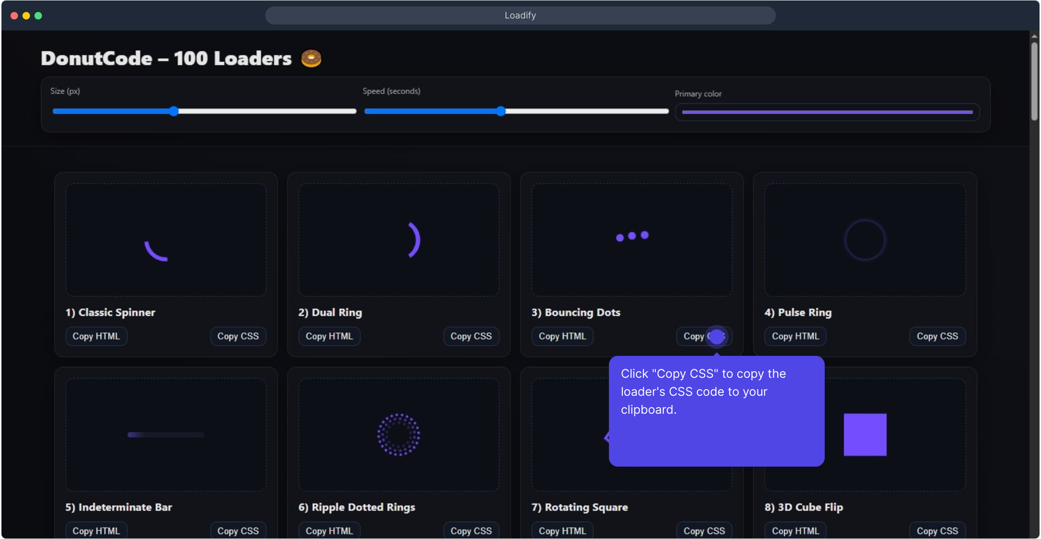 - One-click copy: Copy HTML and Copy CSS buttons for each loader.