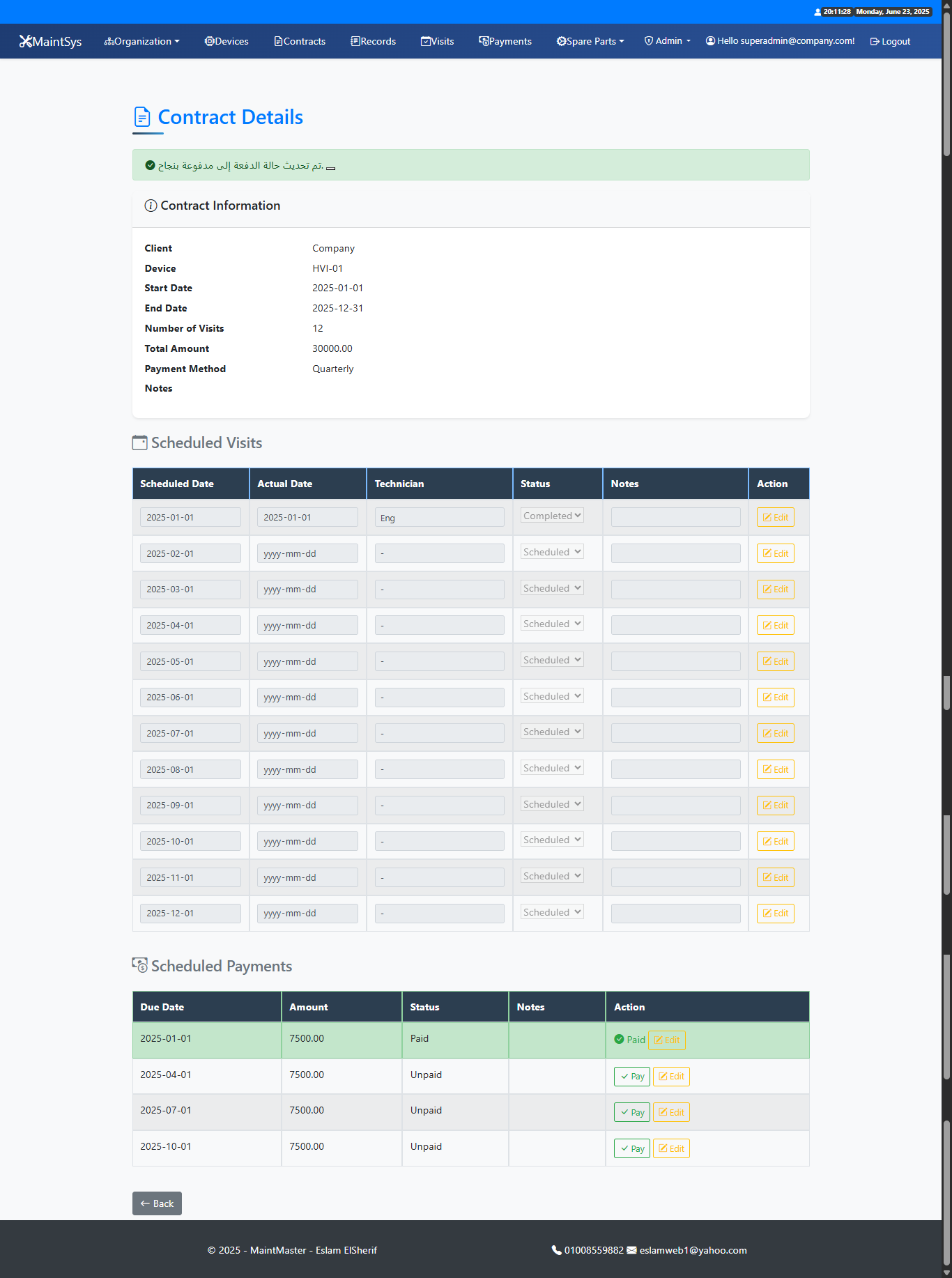 - Maintenance Contracts – Assign to devices, define visit schedules and payment plans