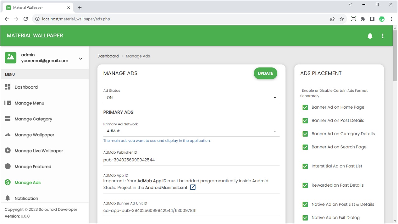 Material Wallpaper v7.0.0 (06/02/2026) - Updated to Android Studio Otter 2 Feature Drop (2025.2.2) - Upgraded Android Gradle Plugin (AGP) to 8.13.2 - Updated project dependencies - Added Auto Change Wallpaper feature - Fixed Save / Share / Apply Wallpaper issues after app data reset or reinstallation on newer Android versions - Improved set wallpaper reliability for Chinese devices (Oppo, Vivo, Xiaomi, and Huawei) by utilizing the system's native wallpaper picker - Bug fixes and performance improvements Material Wallpaper v6.7.0 (02/11/2025) - Android Studio Otter | 2025.2.1 - Android Gradle Plugin (AGP) 8.13 - Update Dependencies - Update PHP Script for the Admin Panel - Fix Keyboard Overlapping Screen in the Search Page Material Wallpaper v6.6.0 (05/08/2025) - Android Studio Narwhal Feature Drop | 2025.1.2 - Android Gradle Plugin (AGP) 8.12.0 - Update targetSdk 36 - Update Dependencies - Update Media3 ExoPlayer for MP4 Live Wallpaper preview - Remove Audio MP4 Live Wallpaper automatically when applied - Fix delay show Native Ad on Exit Dialog - Edge to Edge view improvement Material Wallpaper v6.5.1 (23/06/2025) - Android Studio Meerkat Feature Drop | 2024.3.2 Patch 1 - Fixed crash issue when the app starts - Fixed crash issue on full screen wallpaper details view enabled - Update Retrofit 3.0 Material Wallpaper v6.5.0 (10/06/2025) - Android Studio Meerkat Feature Drop | 2024.3.2 - Android Gradle Plugin (AGP) 8.10 - Update MinSdk 23 - Update compileOptions JavaVersion.VERSION_17 - Dependency Changes for Ad Network Sdk - Migrate to the new OneSignal API - Wortise Ads Removed Material Wallpaper v6.4.0 (15/07/2024) - Android Studio Koala | 2024.1.1 Patch 1 - Android Gradle Plugin (AGP) 8.5 - Update Dependencies - Fix Play Store warnings because outdated PlayCore SDK - Migrate to the latest Firebase Cloud Messaging API (HTTP v1) - Single Ads Sdk Released (admob, applovin, wortise, unity) Ads Sdk Material Wallpaper v6.3.0 (11/02/2024) - Android Studio Hedgehog | 2023.1.1 Patch 2 - Android Gradle Plugin (AGP) 8.2.2 - SDK Migration - Update Dependencies - Fix the number of downloads does not increase - Fix cannot apply locked wallpaper from notification - Returns the menu swipe tab layout feature Material Wallpaper v6.2.0 (13/01/2024) - Android Studio Hedgehog | 2023.1.1 Patch 1 - Android Gradle Plugin (AGP) 8.2.0 - Supports admob-ads-sdk - Remove swipe tab menu and replaced with chips menu - Wallpapers are only loaded on the selected menu - Add option to disable swipe to next or prev wallpaper details in the Config.java - Fix app crashes when notification is sent from OneSignal dashboard - Fix bugs & performance improvements Material Wallpaper v6.1.0 (29/08/2023) - Android Studio Giraffe | 2022.3.1 Patch 1 - Android Gradle Plugin (AGP) 8.1.1 - Update OneSignal 5 - Supports of 4 types of ad network libraries (simple-ads-sdk, triple-ads-sdk, multi-ads-sdk and no-ads-sdk) - Uses simple-ads-sdk as default ad networks sdk - Tab menu can be set offline from strings.xml via Config.java (menu management in admin panel will not be used) Material Wallpaper v6.0.0 (30/07/2023) - Android Studio Giraffe | 2022.3.1 - Android Gradle Plugin (AGP) 8.0.0 - Update Gradle distribution url 8.0 - Update targetSdk 34 - Update Dependencies - Update App Design - Add menu option to show wallpaper with specific category in the tab menu - Ads placement improvements to prevent app rejected because Distrubtion Ads issues - New Ad Network (Wortise) added - New Rewarded Video Ad format for all Ad Networks - Lock wallpaper option and watch Rewarded Video Ad to unlock it - Add AppLovin Discovery Banner MREC (Fill the Native Ad position) - Add Search History - Dynamic blurry background changed on swipe gesture in the wallpaper details - Change design of exit dialog with Native Ad supports - The application is fully accessed online - Update the admin panel script & database (see documentation for the migration guide steps) Material Wallpaper v5.1.0 (08/02/2023) - Android Studio Electric Eel | 2022.1.1 Patch 1 - Add handling when the app fails to connect to the server - Add new wallpaper order for tab menu (Most downloads and oldest) - Request permission in the mp4 live wallpaper preview - Fix app crashes on click wallpaper when load more pagination in progress - Enable/disable Info, Save, Apply, Favorite and Share menus from Config.java - FCM notification topic and OneSignal App ID must be configured for both the android studio project and the admin panel (notifications.xml and the admin panel) Material Wallpaper v5.0.0 (30/01/2023) - Android Studio Electric Eel | 2022.1.1 - Android Gradle Plugin (AGP) 7.4.0 - Update Gradle distribution url 7.5 - Update targetSdkVersion 33 - Dynamic tab menu from the admin panel - Enable / disable menu, category and wallpaper from the admin panel - Add AppLovin App Open Ad - Add dialog option to close app - Unity ads are back added - Support MP4 format (live wallpaper) - Live badge for live wallpaper - Switch to simple mode automatically when the number of tab menus is less than equal to 1 - Separate management between Wallpaper and Live Wallpaper in the admin panel - Prevent app accessed using vpn or packet capture apps Material Wallpaper v4.4.0 (16/08/2022) - Android Studio Chipmunk | 2021.2.1 - Update Dependencies - Add Google Ad Manager Ads (New) - Add IronSource Ads (New) - Add Meta Audience Network - Waterfall (New) - Remove Mopub Ads (has been acquired by AppLovin) - Remove Unity Ads (caused Google Play Error Message) - Redirect App (if app inactive, suspended, etc) - Add In-App Update features - Fix Firebase Analytics not showing - Fix app crash on wallpaper click in larger data Material Wallpaper v4.3.0 (19/02/2022) - Android Studio Bumblebee | 2021.1.1 Patch 1 - Update Gradle 7.2 - Update targetSdkVersion 32 - Security Improvements (use Server Key for server connection) - Add New Ad Network (AppLovin Discovery) - Add AppLovin MAX Native Ad (Manual) - Native Ad view UI improvement - A