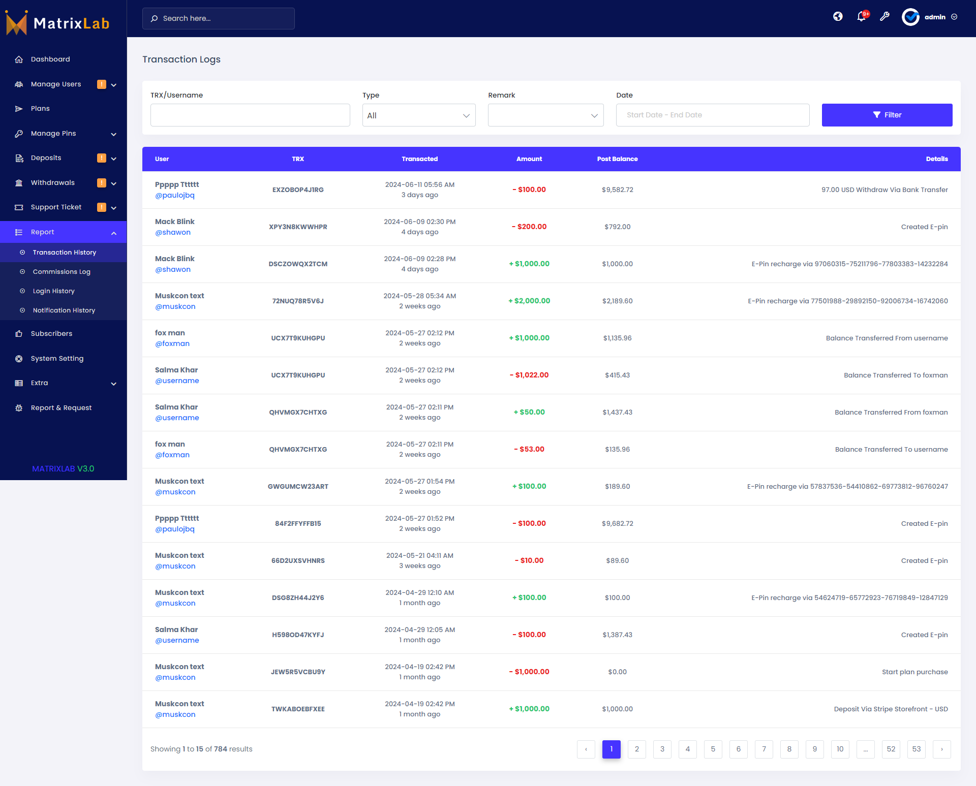 - [ADD] Transaction Filter Admin & User Both Panel