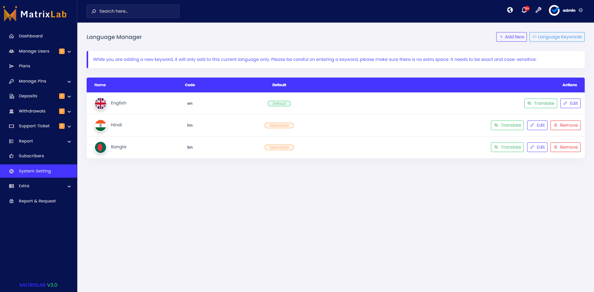 - Manage Language.