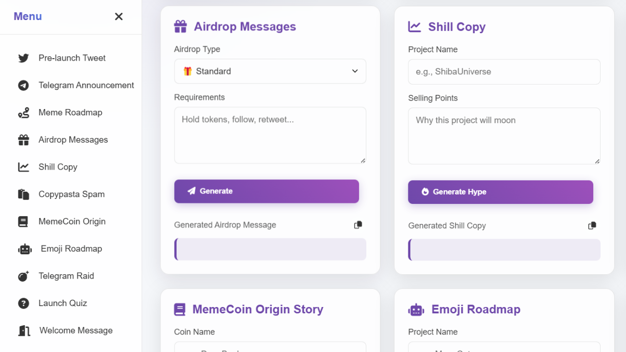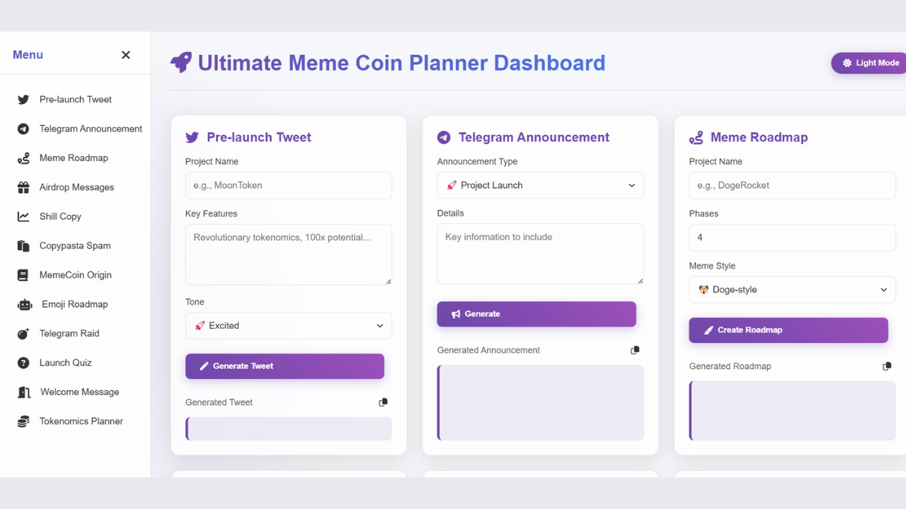 This complete meme launching solution helps meme coin developers plan, strategize, and market their coins before launch using AI-powered tools. From viral tweets to Telegram raids, this dashboard automates crypto marketing with Gemini AI 2.0 Flash. Save months of development – buy this fully functional, customizable code today and dominate the meme coin space!.