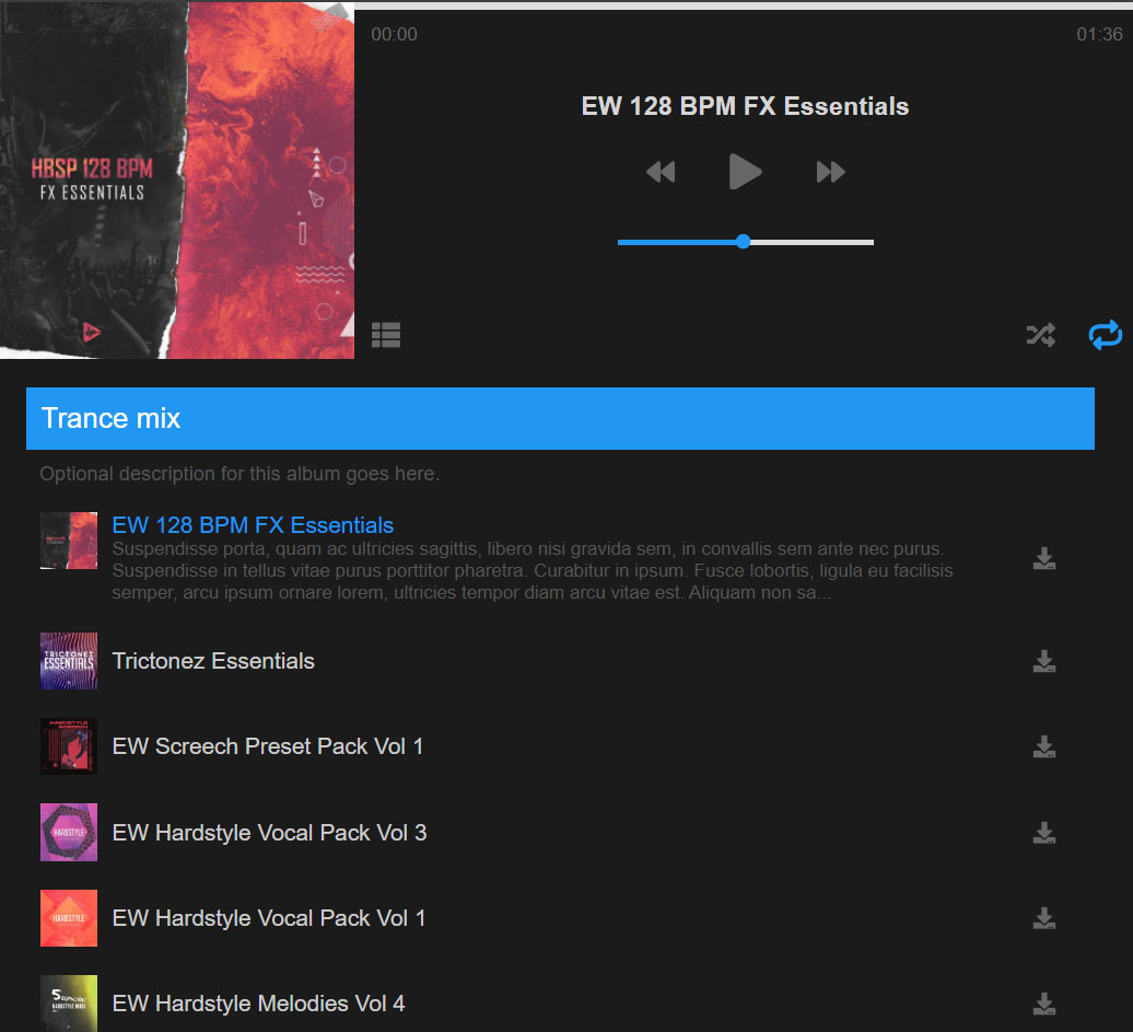 Using Accordion Addon for Modern Audio player enables you to display your albums and playlists in accordion form / list inside the player. This enables users to quickly glance over existing content inside the player and choose their favorite songs.