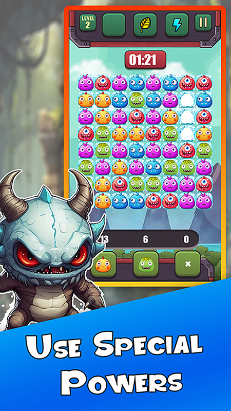 In this fun game, your goal is to solve the monster tile puzzle by matching identical tiles. Each tile features a different monster, and your task is to find 3 tiles of the same monster to clear the board. Once you match three tiles, they will be released, and you’ll continue matching until all the tiles are gone. The more match you find, the faster you can progress through the levels. But be careful—time is ticking, and each move counts! Keep an eye on the tiles, plan your moves, and aim to clear them as quickly as possible