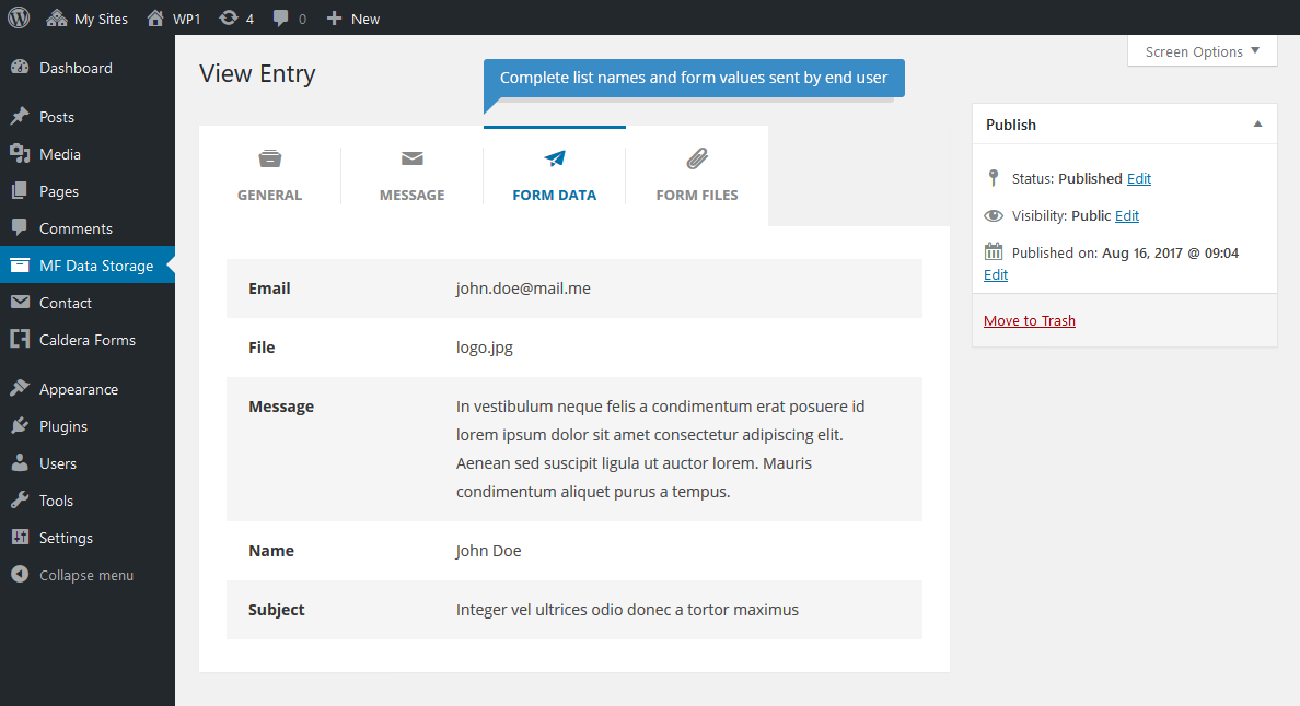 The plugin starts collecting data from contact form submissions immediately after activation – no additional setup from admin is required. All entries are stored based on native WordPress functionality, called Custom Post Type and are available under the dashboard menu item MF Data Storage. Under the above-mentioned menu item the user has the ability to: