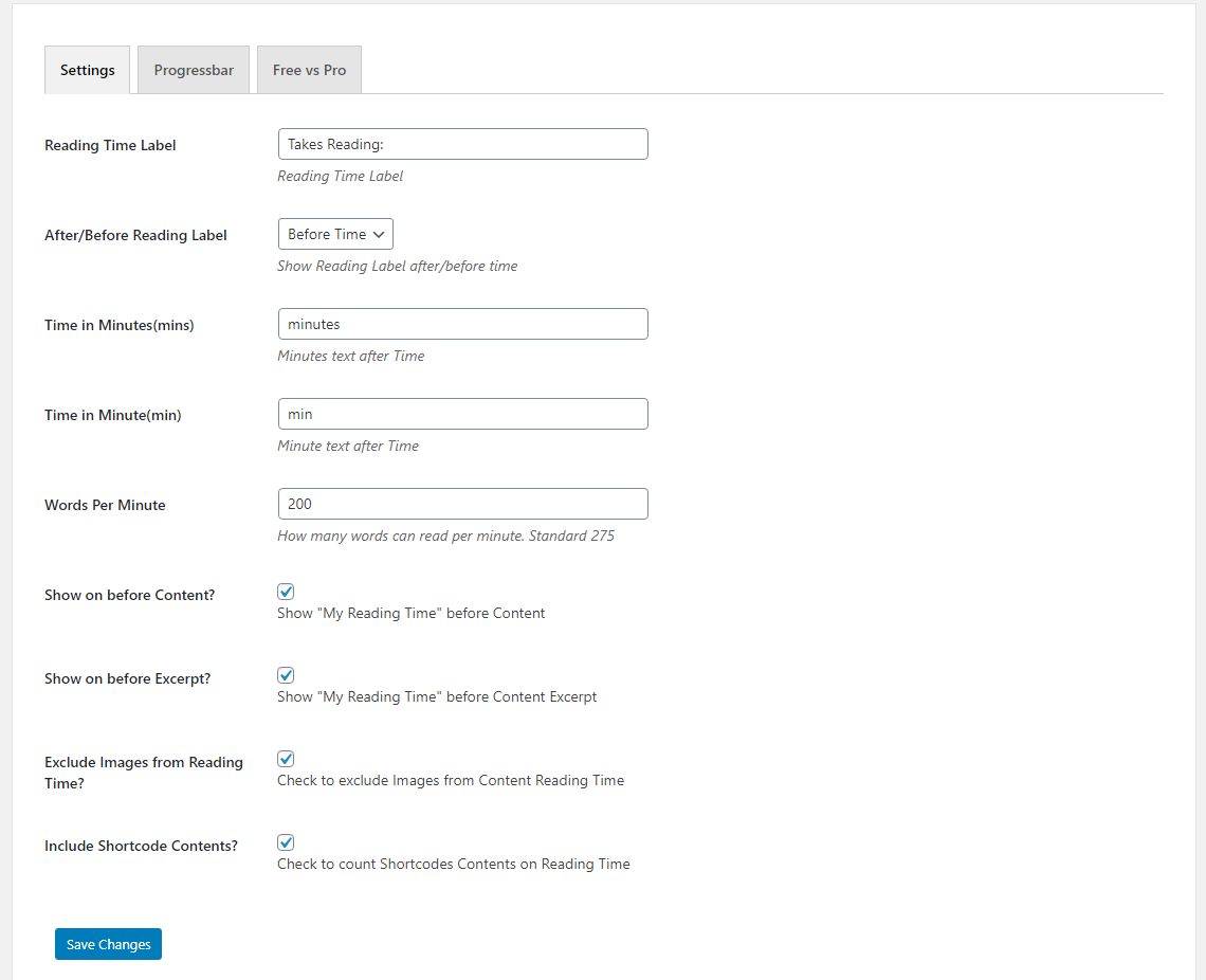 Reading time pro plugin insert’s dynamic reading time and progress bar at the top. You will get full control to change the progress bar color. You can disable progress bar and set the progress bar height in pixel too. 275 Words per minute is standard for reading time. But you can manually set Words per minute yourself.