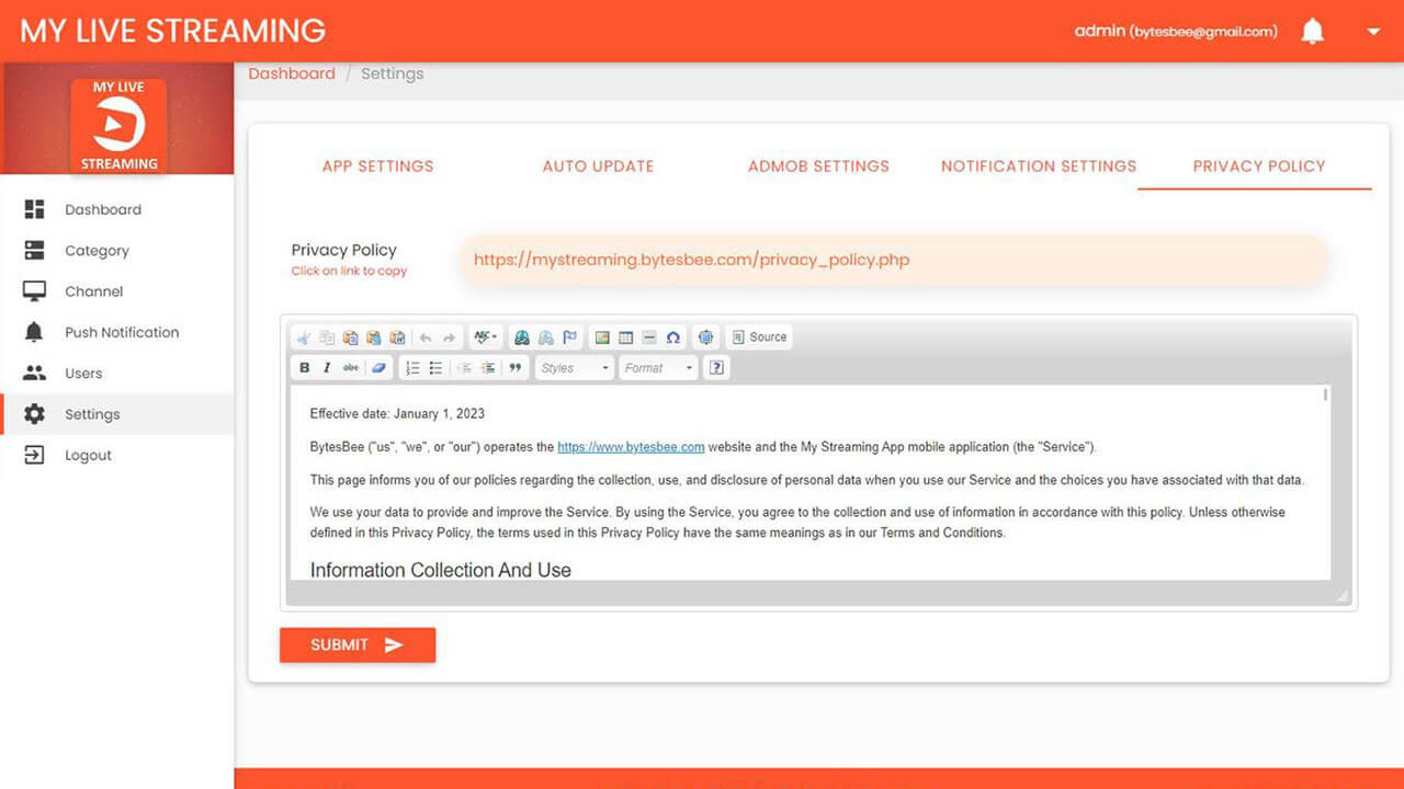 - Manage Privacy Policy content from admin panel