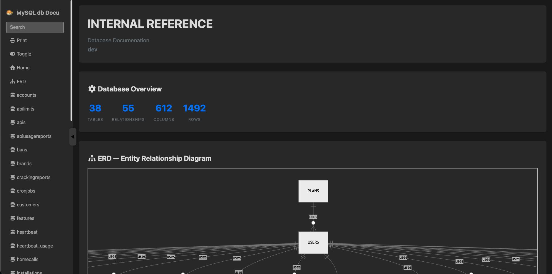 This docu tool for databases catches the information saved in your database and generates database reference documentation for your MySQL databases automatically.WHAT IS IT?