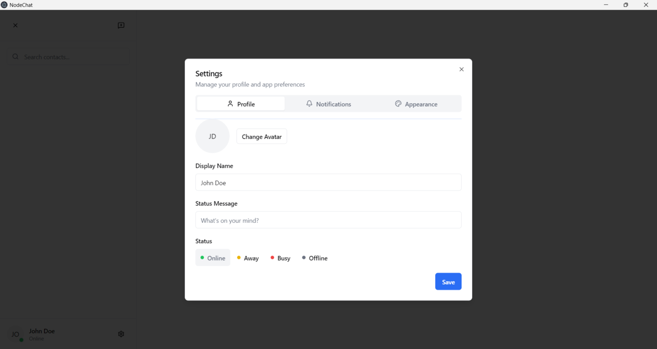 npm installandnpm run buildto get started. - Status & Availability – Set a custom status message and choose your availability (Online, Offline, Away, etc.) visible to other users.