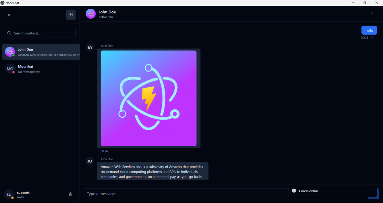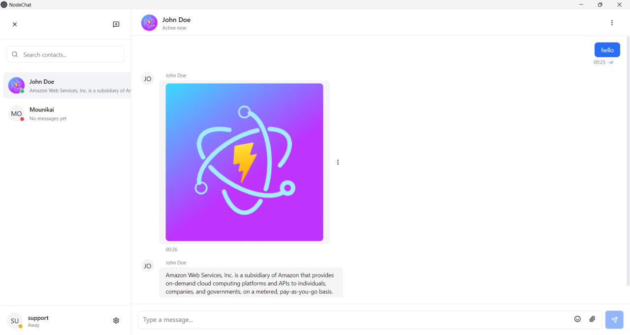 NodeChat is a secure, standalone desktop chat application built with Electron.js, React, TailwindCSS, and Socket.IO. It allows teams to communicate instantly without internet dependency or complex setup. Designed for office environments, NodeChat runs completely offline within your local network — no servers, no subscriptions, no external databases.