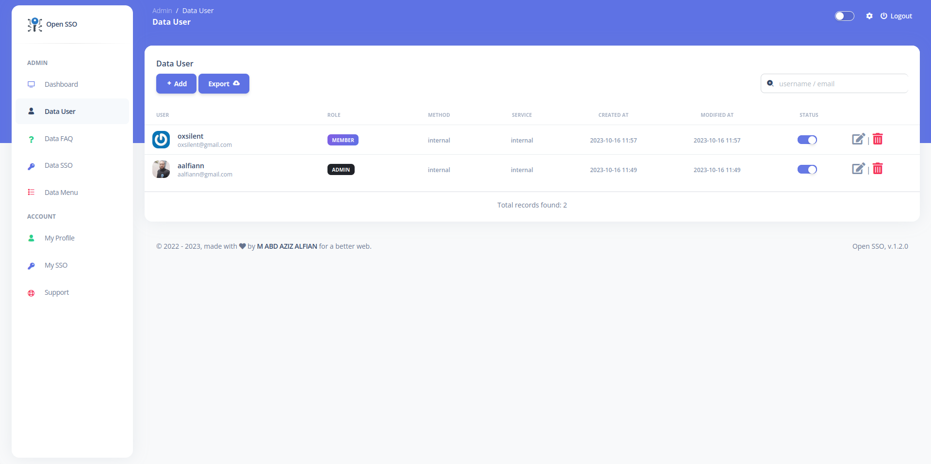 Version: 1.6.0 - Add Github login. - Add Gitlab login. - Add Facebook login. - Add Twitter X login. - Add Microsoft Entra login. - Add new page deletion policy. - Fixed typo in file `db.mysql.sql`. - Fixed fontawesome doesn't displayed correctly. - Fixed baseAssetsUrl doesn't working as expected. - Fixed Total User List in yearly - Upgrade dependencies - Update opensso docs