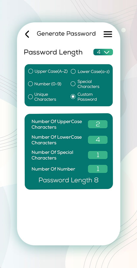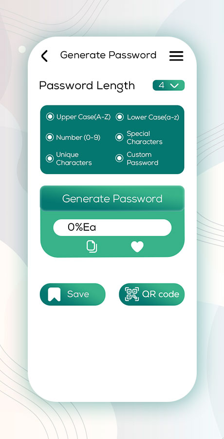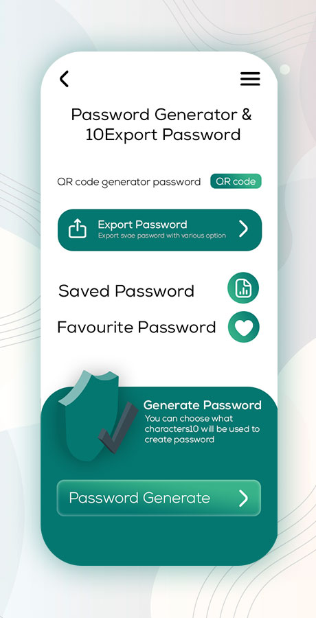 FEATURES OF PASSWORD GENERATOR :- > App provide password generator functionality. > Generate Passwords by selecting uppercase, lowercase, numbers and special characters. You can also generate unique characters password and specify password length. > Generate custom password by entering specific characters you want like (2 uppercase characters, 1 lowercase , 3 numbers and 1 special character). > App display password strength too like good, weak, poor or strong. > Generate QR code of generated password and share it. > Save generated passwords and add to favourite list. > User can export password with custom selection from different document. > App provide two type of export. - Excel - PDF > In PDF export password protected or without password.