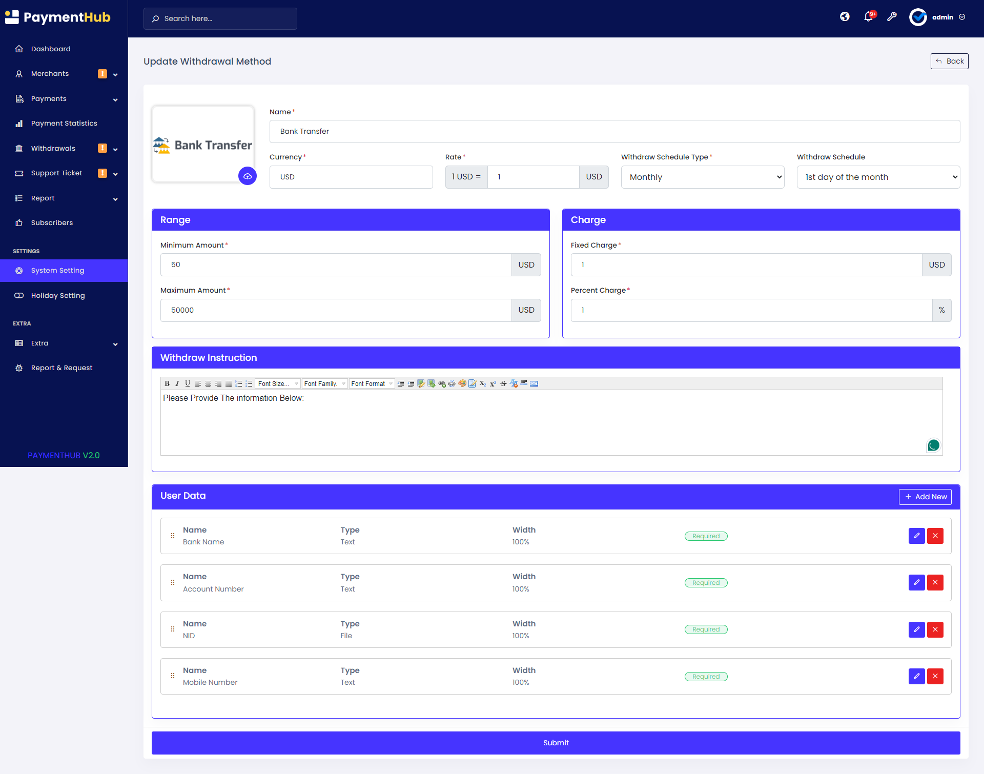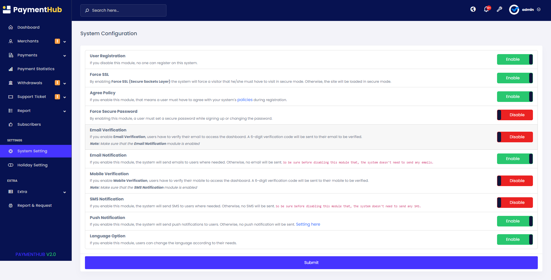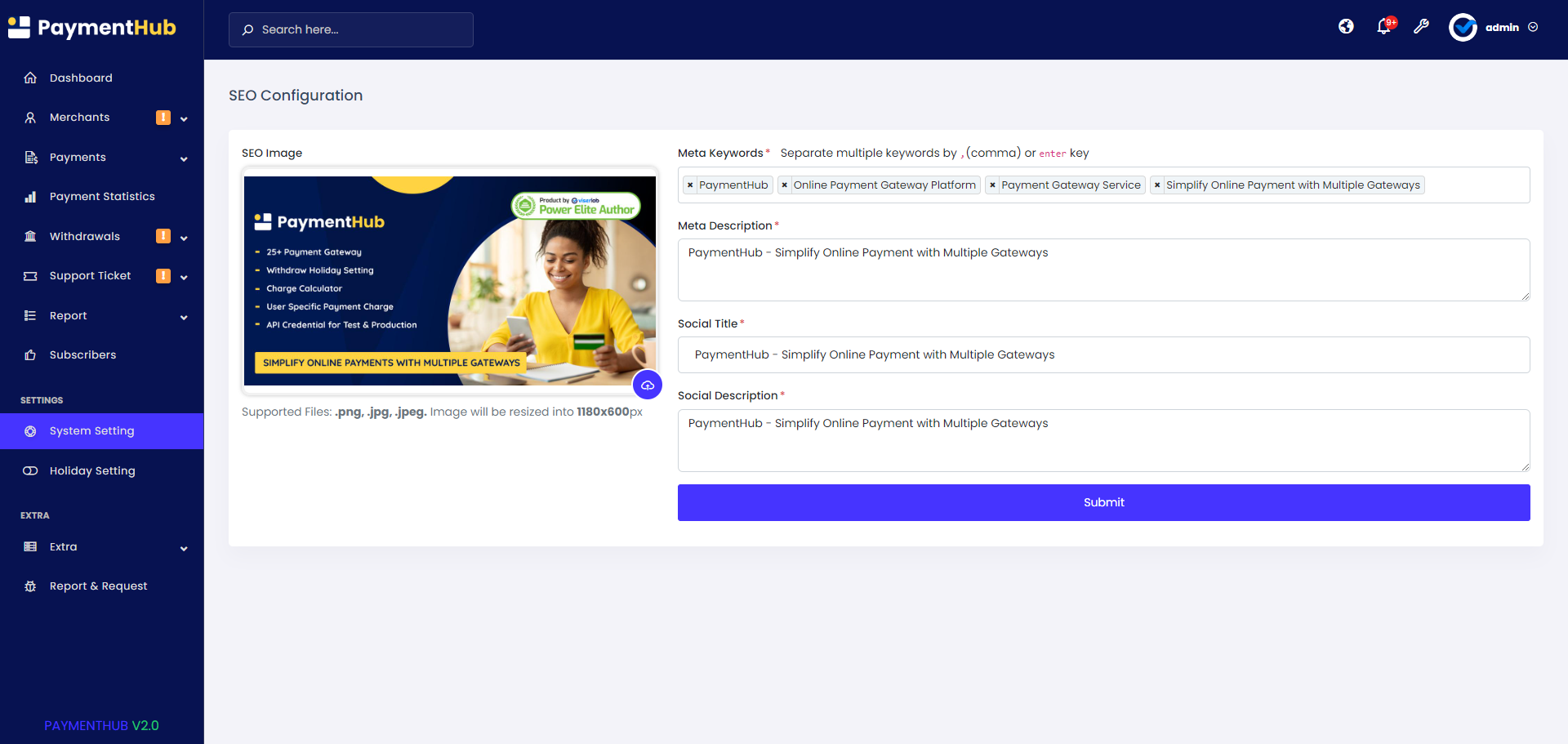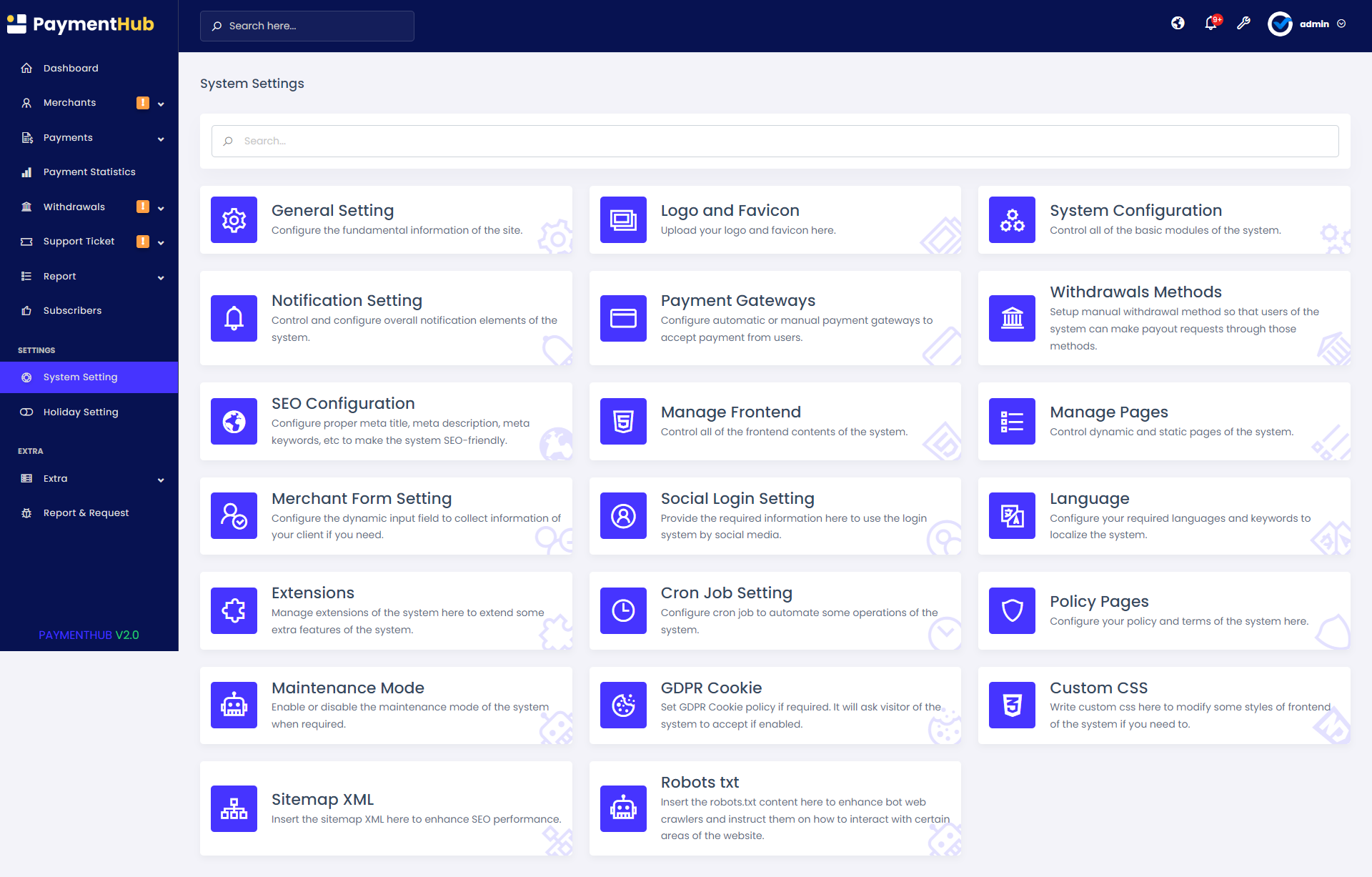 Manage merchants, payment gateways, system configurations, withdrawal processes, frontend content, SEO, and more with ease.