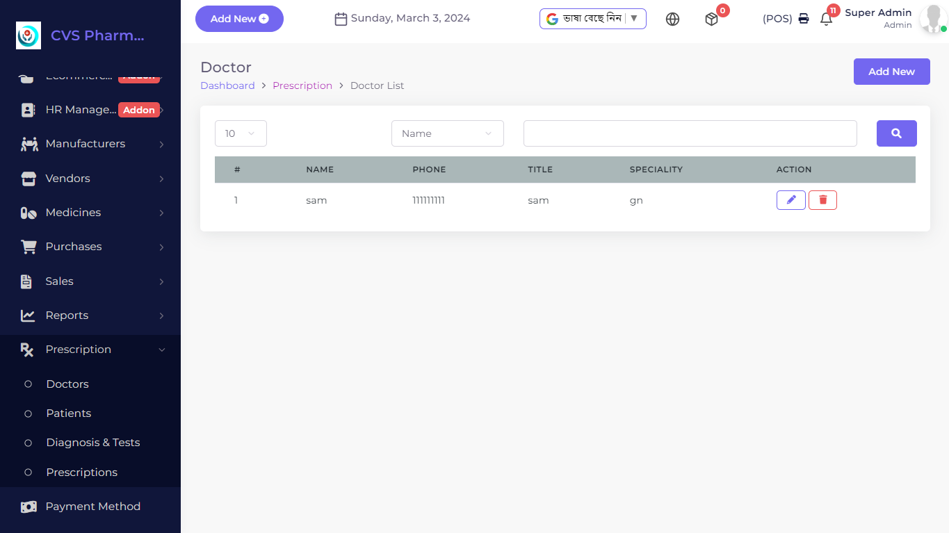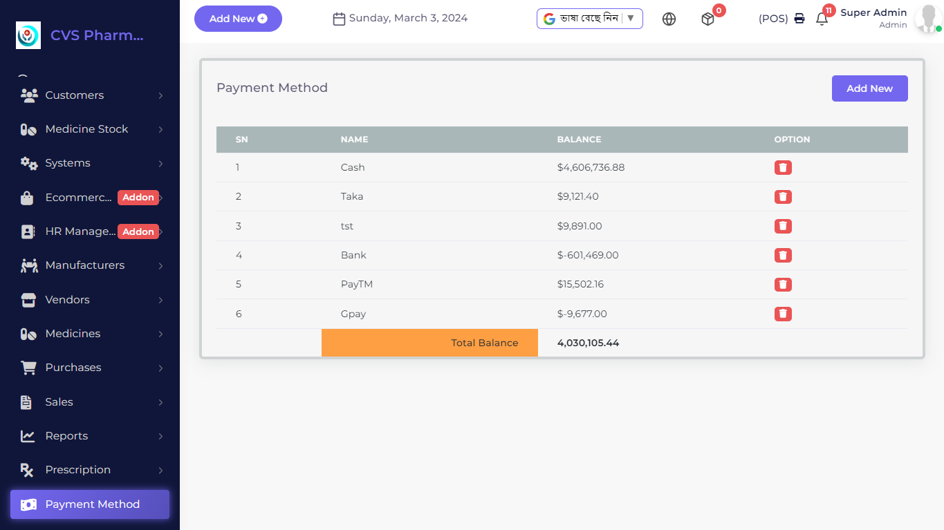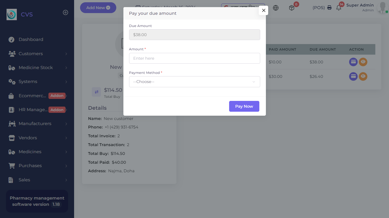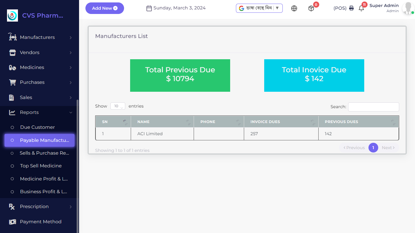 Pharmacy Software solution is built to manage overall pharmacy business activities including medication management, purchase management, supplier or manufacturers management, stock management, sales management, and daily or monthly accounts management. Most importantly follow up on the low stock of medicine manage purchases from manufacturers, and manage the customer’s and manufacturers’ due payments. This software is easy to use and manage with easy medicine search, easy invoice creation, pharmacy faster daily operation, and date-wise details report.
