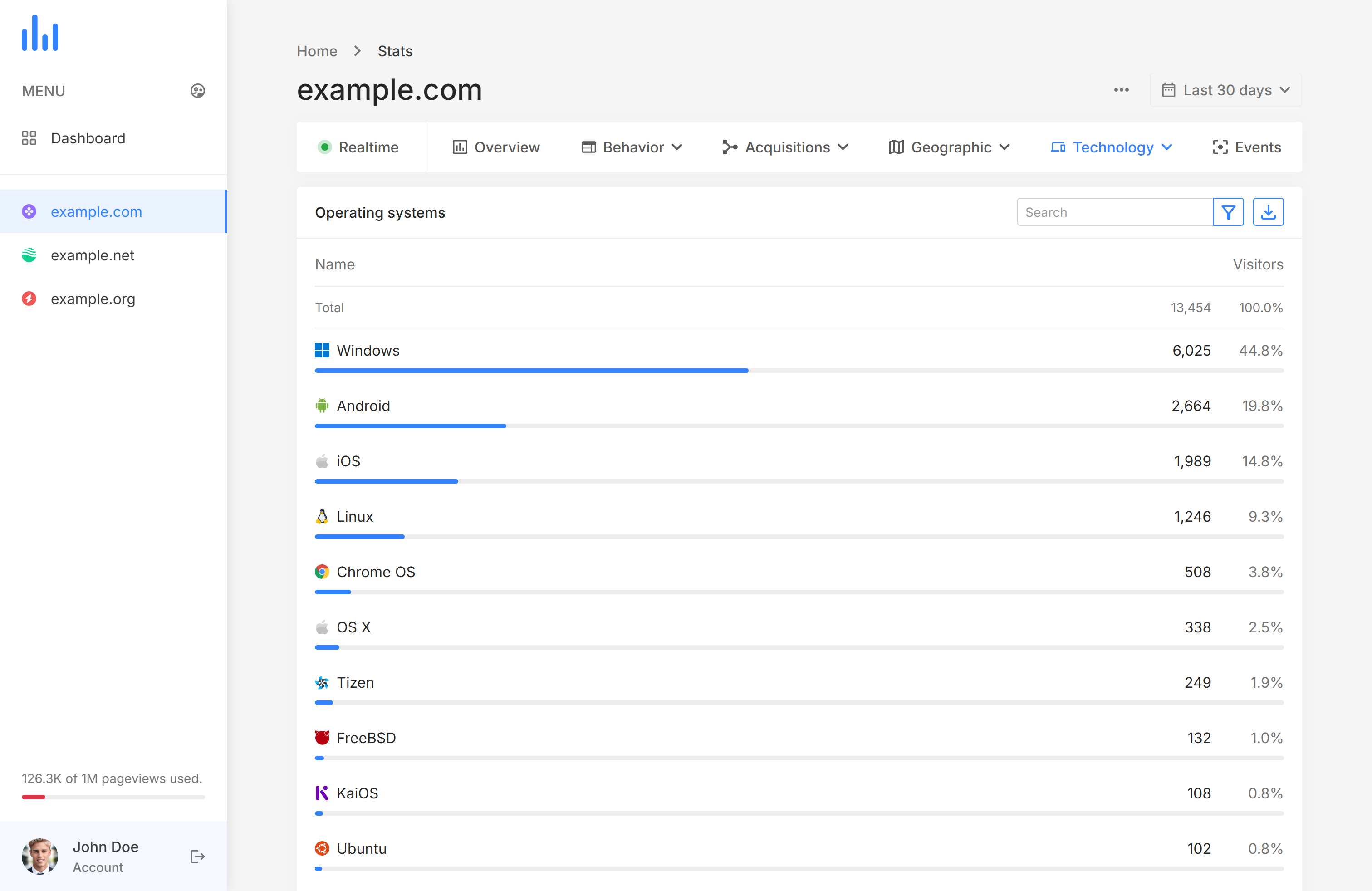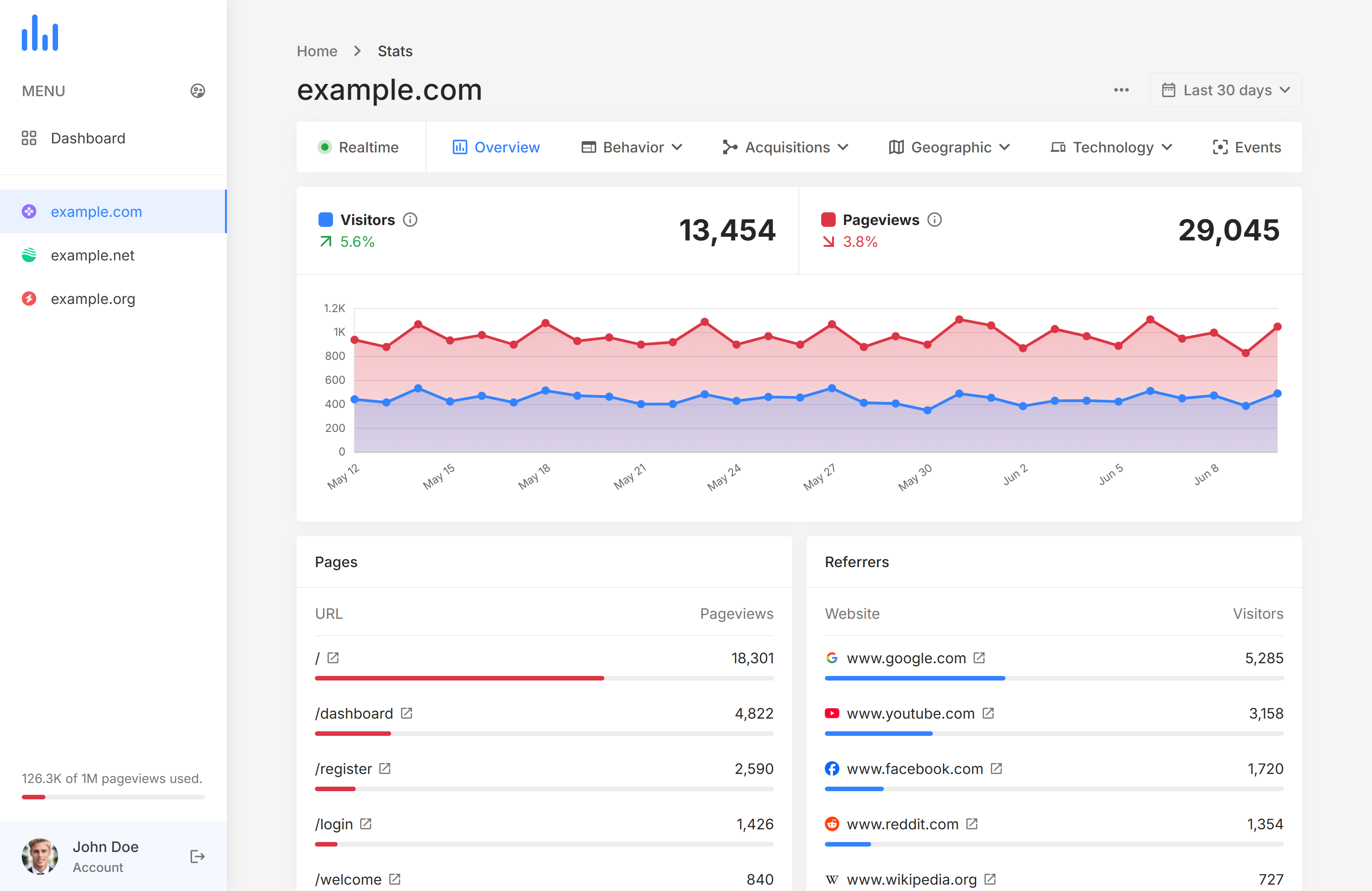 DASHBOARD – Get the overview of your account and your tracked websites.STATS – Get specific statistics & analytics reports for a website: