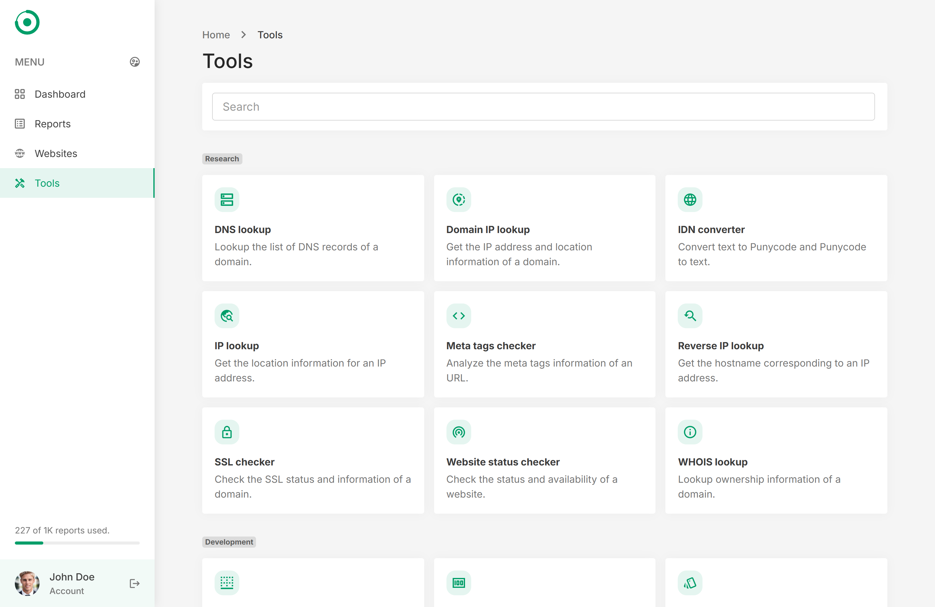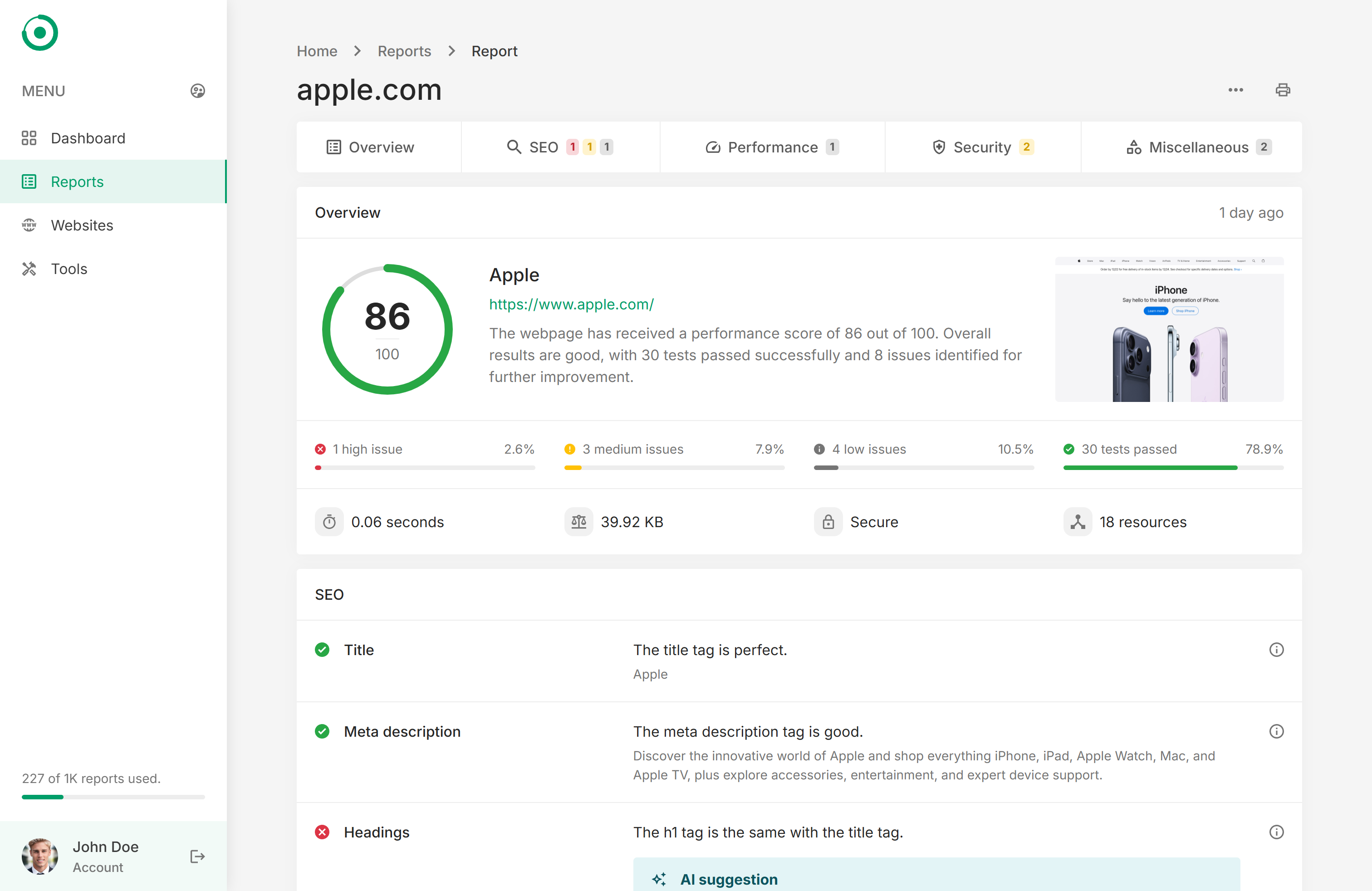 DASHBOARD – Get the account overview at a glance. Quickly manage your latest or underperforming Reports.REPORTS – Manage the SEO reports and get insightful results: