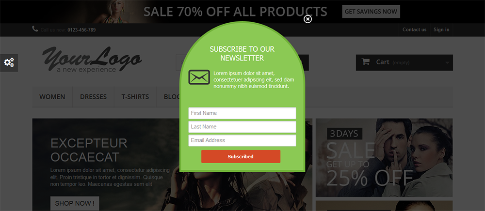 “iContact Subscription with Custom Popup for Prestashop” is an amazing email subscriber module which allows the site Admin to create Custom Popup, place YouTube/Vimeo embed videos, image or any sort of HTML/custom content in the subscription popup and the Visitors can Subscribe their email to the iContact subscription list. It is flexible, best and simple way to subscribe email for newsletter. Admin can set “iContact Subscription with Custom Popup for Prestashop” module through a Popup style which has various display options.