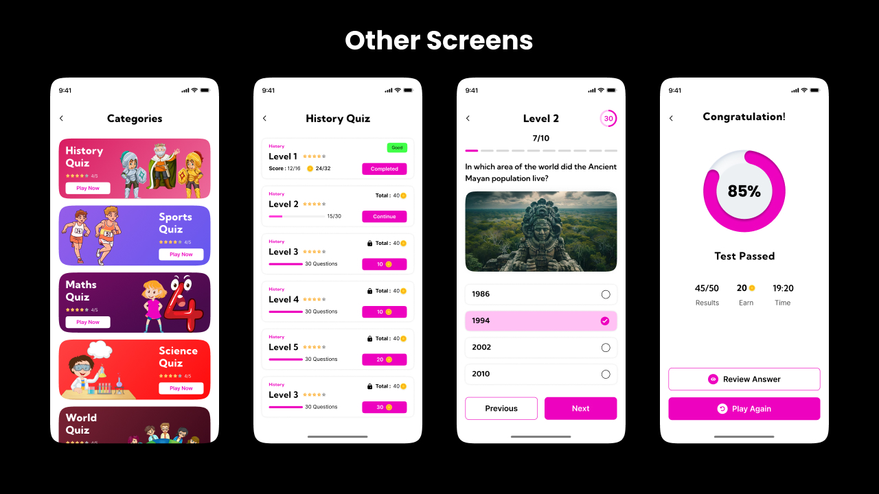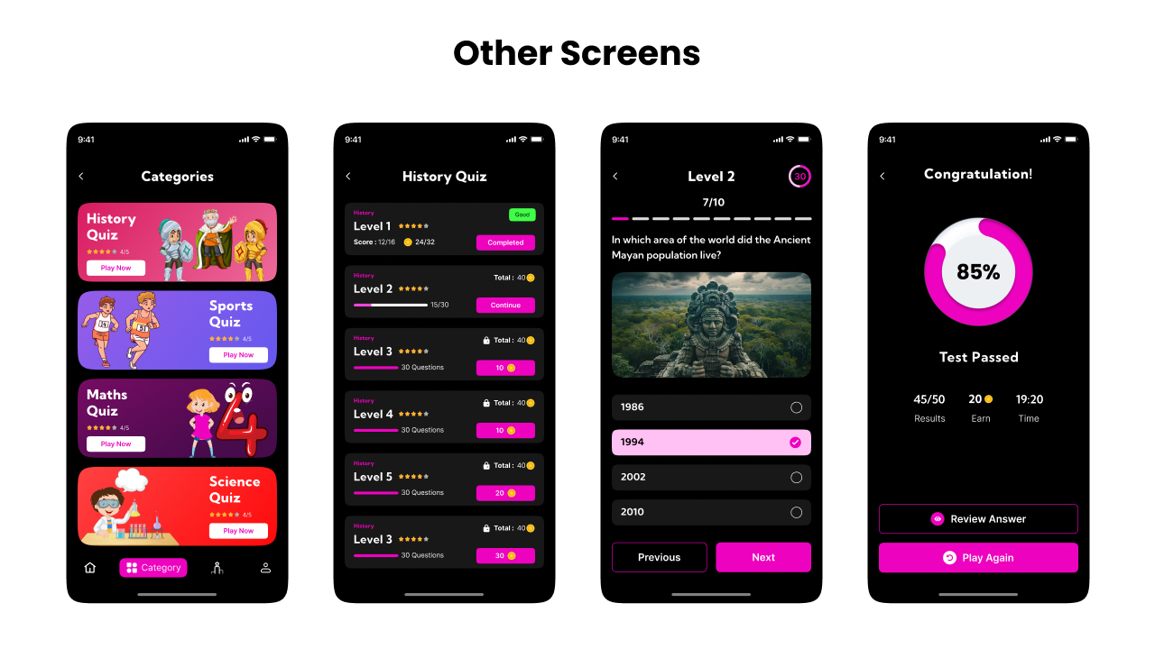 - Push Notifications: Notify users of quiz availability, scores, and app updates via push notifications.
