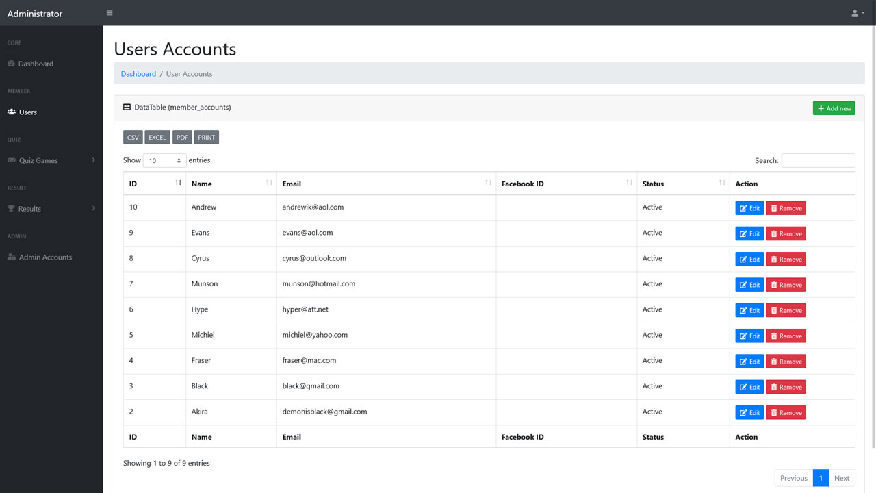 - Datas can be export via admin (CSV, EXCEL, PDF, PRINT)
