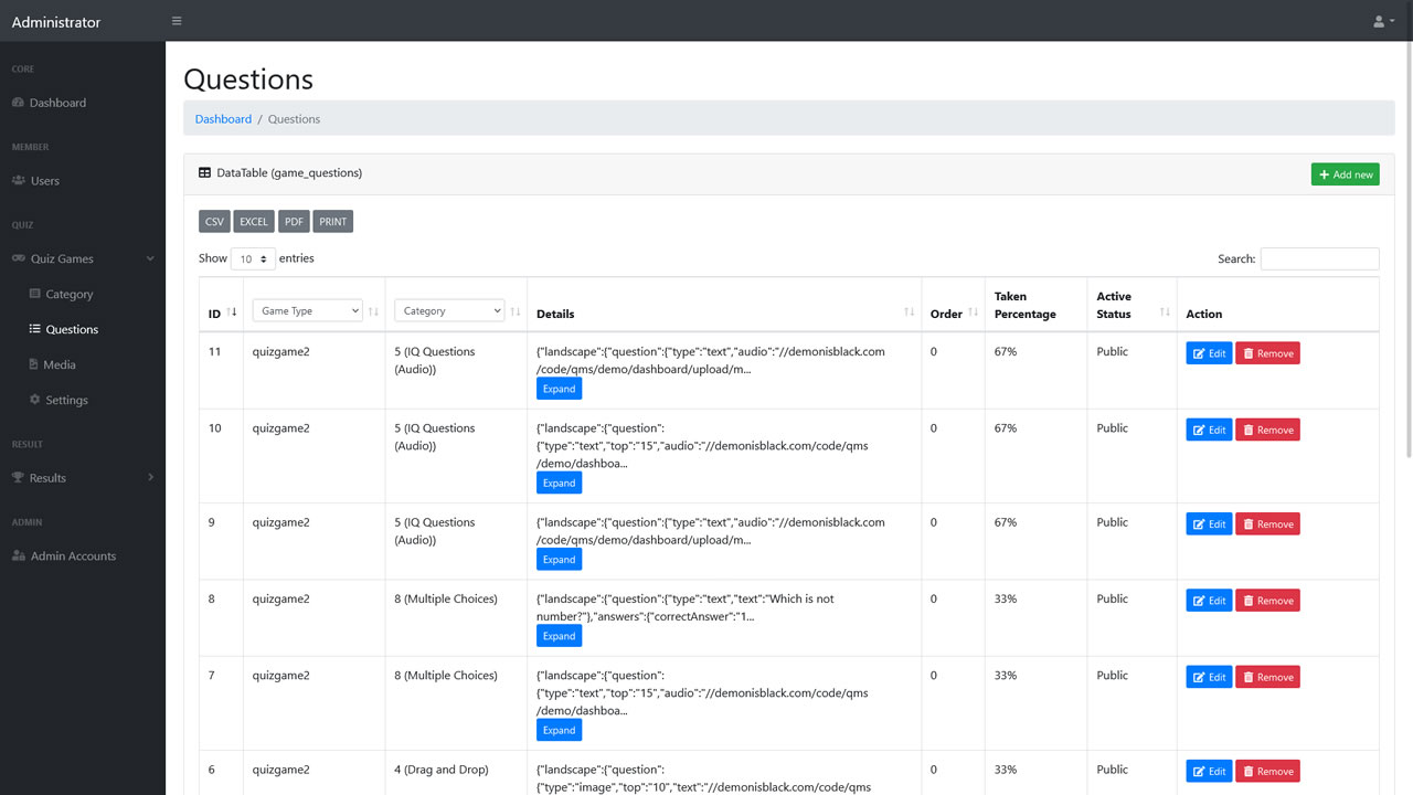 Private quizzes can also be created using access codes. Users enter a given code to join a private quiz that is not publicly listed. The Admin Dashboard lets you manage categories, questions, and media files, while also reviewing detailed reports of each player’s performance, including time taken, answers, and percentage scores.