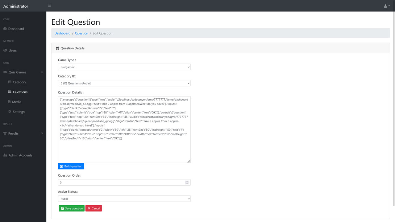 - Build questions layout via admin.