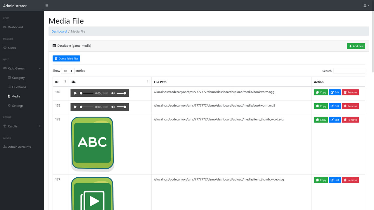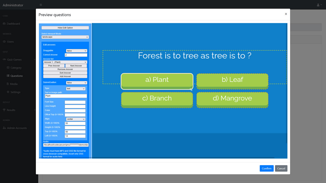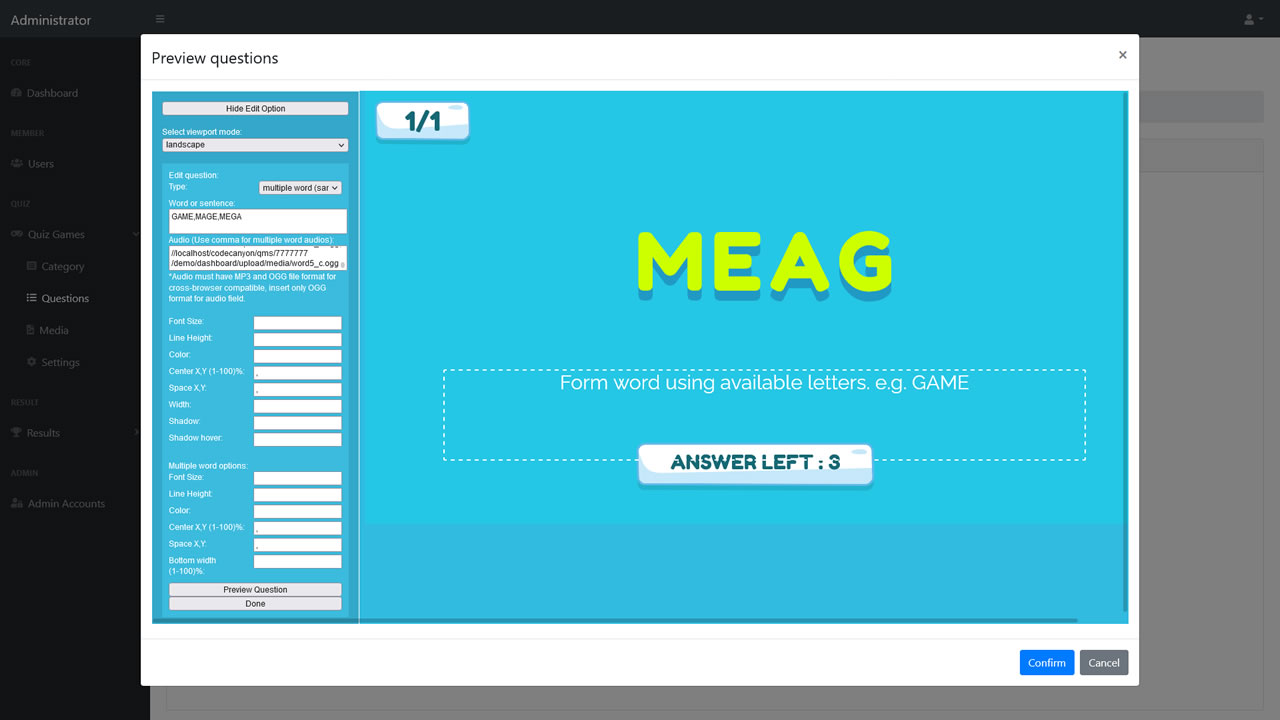 - Upload media files like Image, Audio and Video for questions assets via admin.