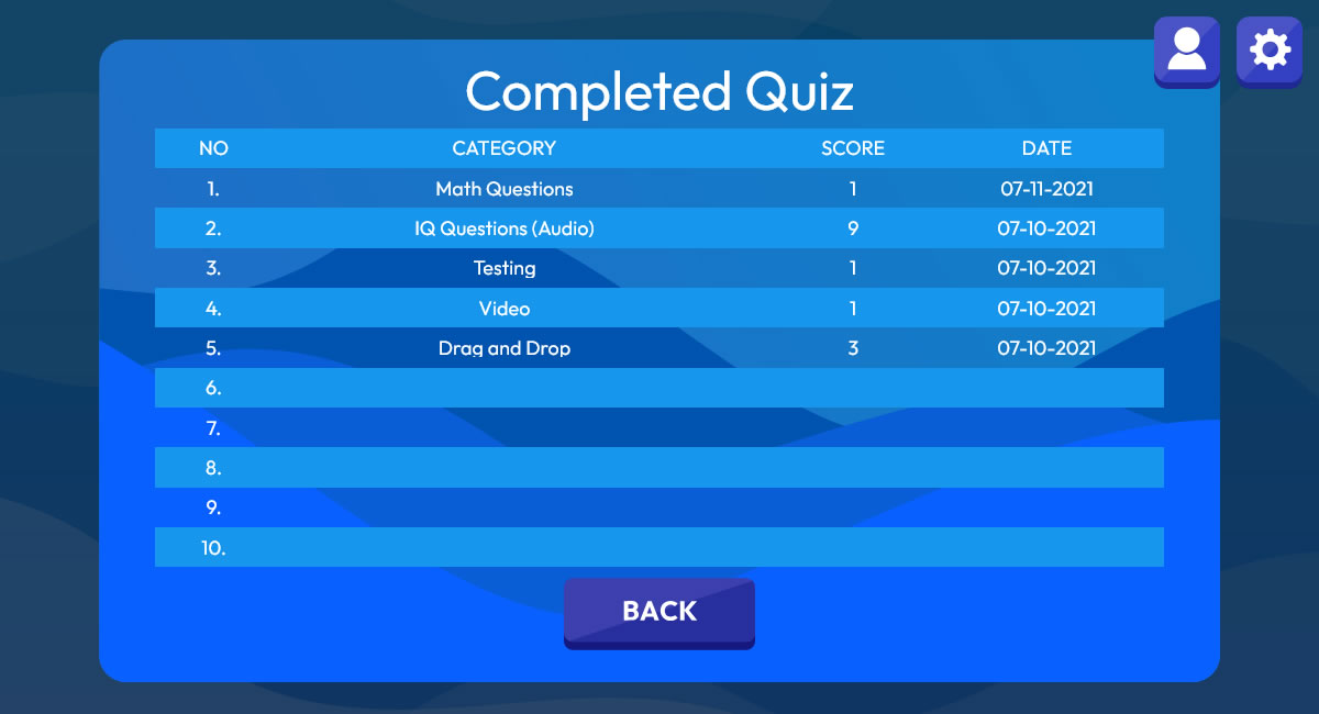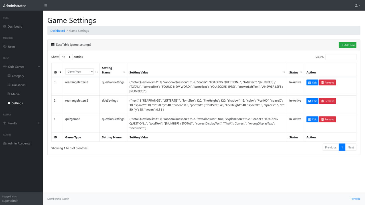 - Game settings like total questions or timer can be set for each category via admin.
