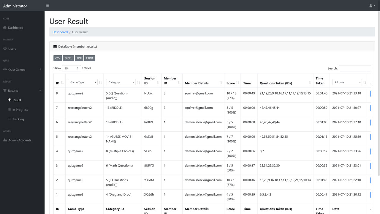 - Check result and questions report from all members via admin.