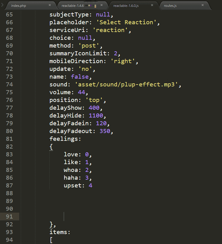 To change the reaction types in the plugin you should open the file reactable/assets/js/reactable-1.6.0.js and edit the lines in the following image.Plugin’ Workflow