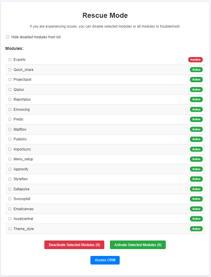 In any system, unexpected issues can arise—whether it’s a module malfunction, server failure, or a configuration error—that causes downtime or performance degradation. When your CRM stops functioning, it impacts your business operations and client relationships. With the Rescue System module, you can safeguard your CRM, ensuring that you always have a failsafe mechanism in place to disable problematic modules and restore normal operation without the need for complex interventions.