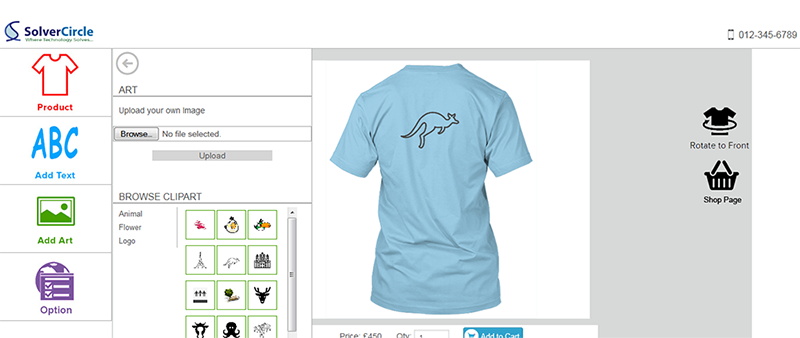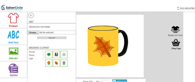 By this plugin customer can design the product as per their need such as add Text, Image or Clip-Art by different Style, Font, Color, Size, Alignment and many more. Customers are able to design their own products and they can upload logo or image to any position of products or can select existing logo from the sample items. Customers can add normal text or curved text and can rotate the text in any position. They can view the preview of products as designed. Customer can “Add to Cart” Product with custom price.