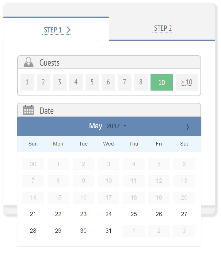 This is a 2 step form for building your own restaurant booking application. On a first step user has to select number of guests, date and time. On a second step user has to fill in contact details and answer on custom questions.