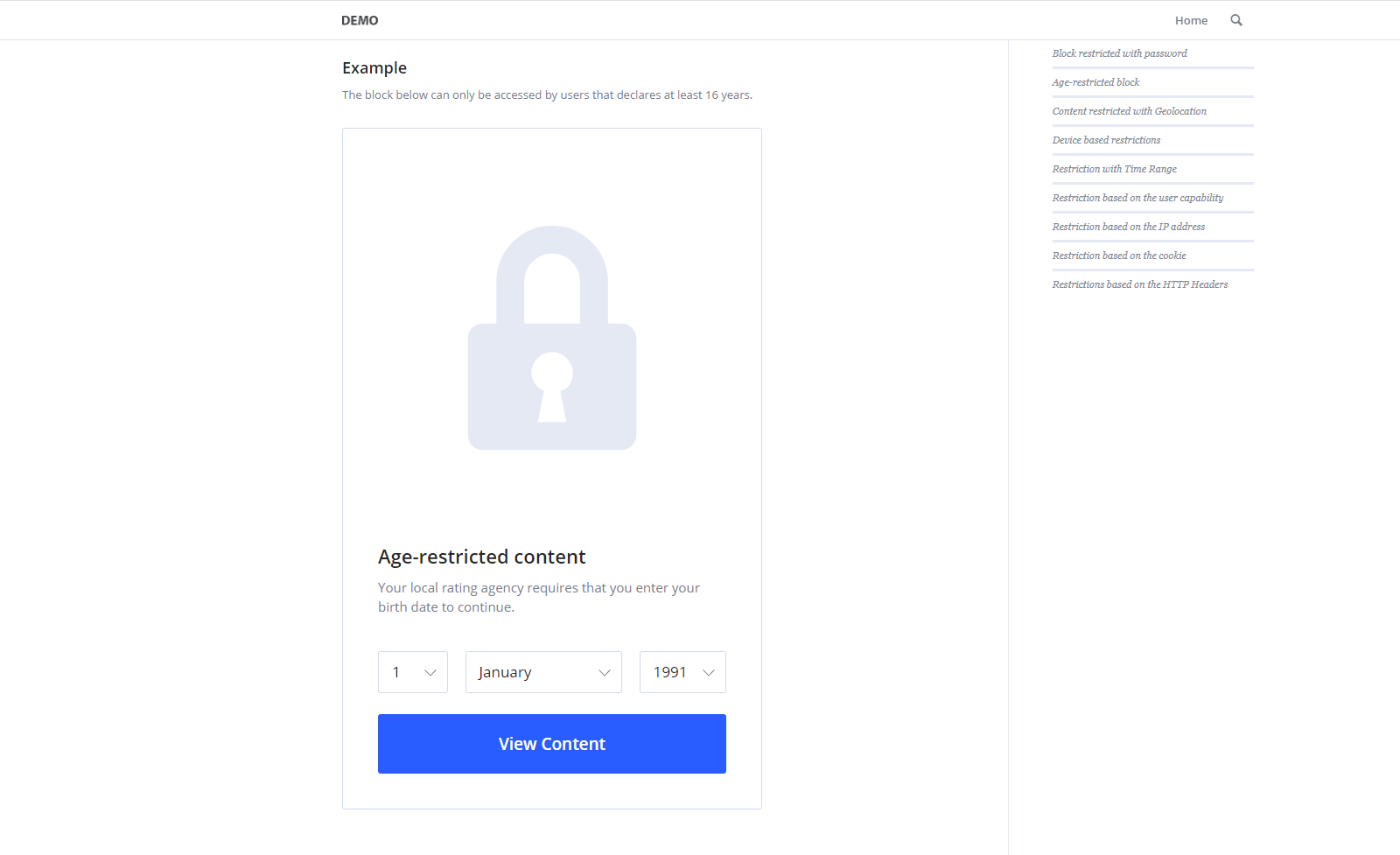 The plugin displays the content associated with this restriction if the user meets the age requirements defined in the back-end. Note that the user can declare its age by submitting the birth date with the provided form.