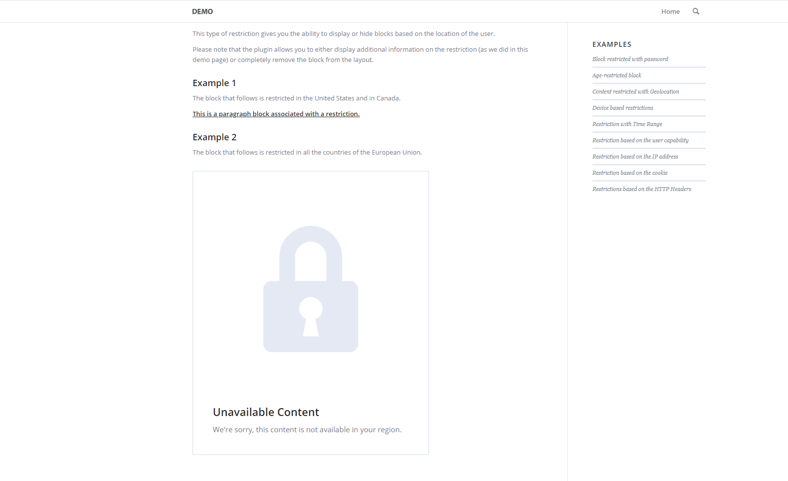 This type of restriction allows you to display or hide blocks based on the location of the user.