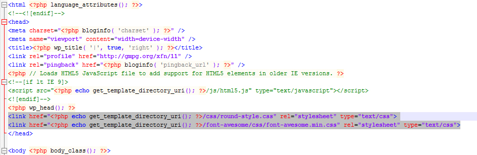 <link href=”<?php echo get_template_directory_uri(); ?>/css/round-style.css” rel=”stylesheet” type=”text/css”> <link href=”<?php echo get_template_directory_uri(); ?>/font-awesome/css/font-awesome.min.css” rel=”stylesheet” type=”text/css”>