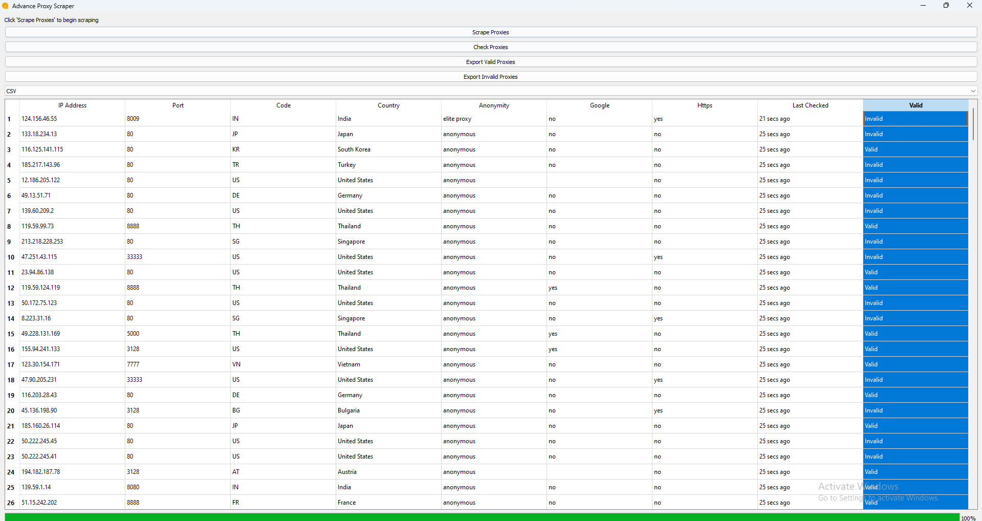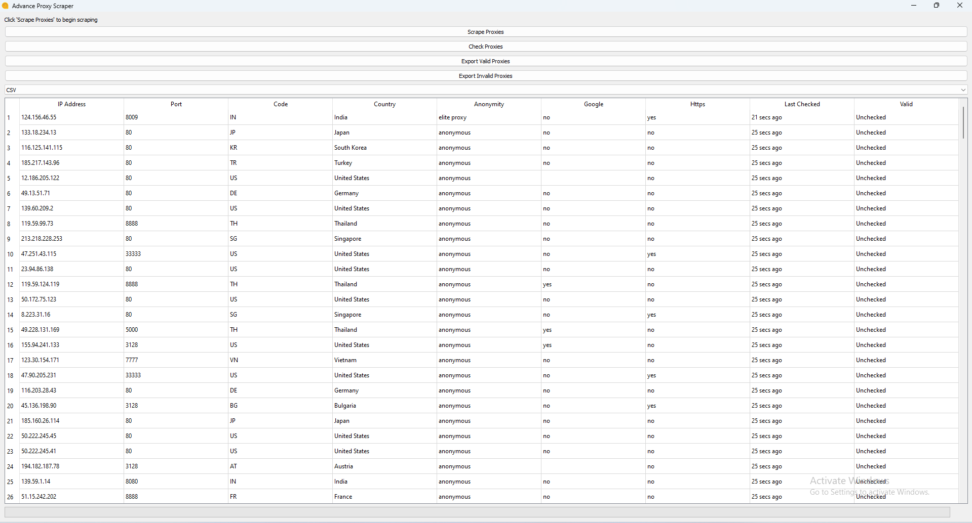 - Click “Scrape Proxies” to harvest the latest proxy list