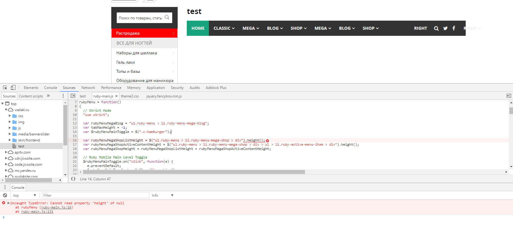 Figured it out, and looks like you have a bug – instead of rubyMenu(); in the end of JS file, you should write jQuery( document ).ready(function() {rubyMenu();}); otherwise, i’ve got zero height for shop block all the time.