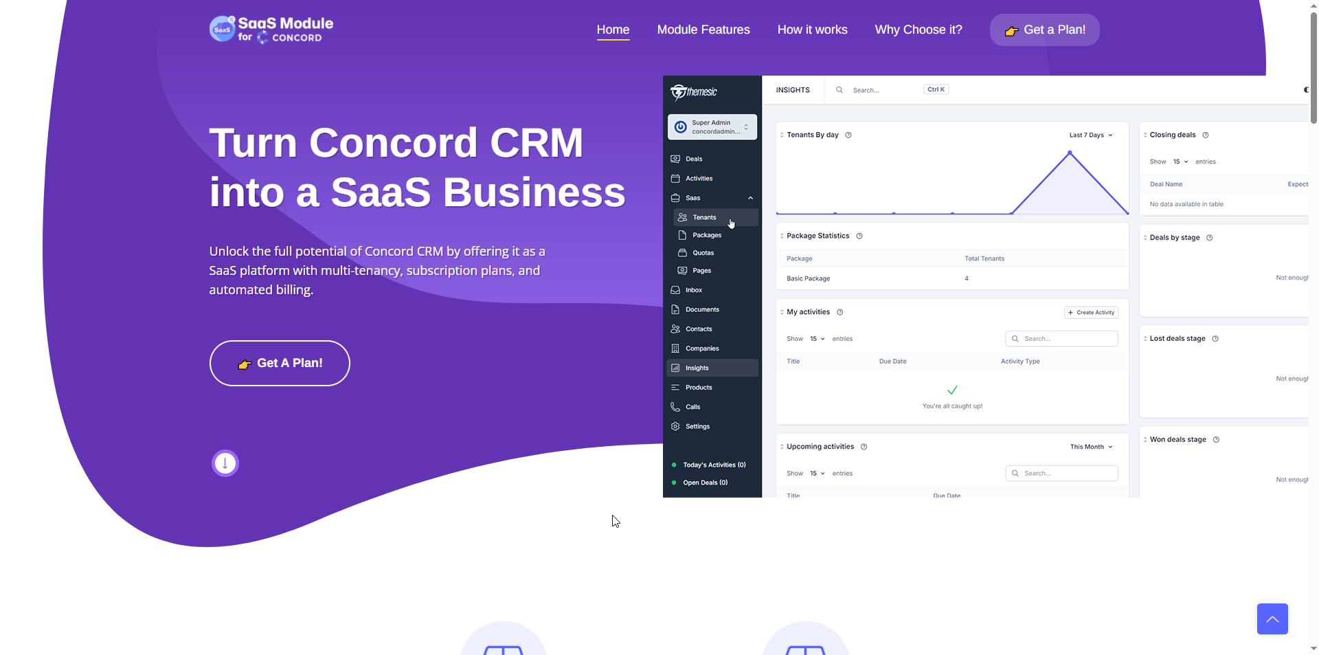 Transform your single Concord CRM installation into a scalable SaaS business model with complete tenant isolation and automated management. Our SaaS module for Concord CRM bridges the gap between traditional CRM usage and profitable SaaS operation by adding comprehensive Super Admin Management System with tenant provisioning, subscription billing, and usage-based quota management. This multi-tenant CRM platform helps businesses create recurring revenue streams, scale CRM services efficiently, and maintain complete control over customer data and billing processes.