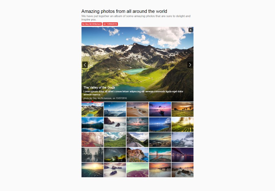 This is a beautiful, powerful and customizable grid based image gallery. What is characteristic is that the content is displayed and functions within this grid. The thumbs are bigger and contribute to the design. The big images are opened in place, within the grid, connected to the thumbs themselves. Coupled with other design elements and effects, this creates a beautiful look and a great functionality.