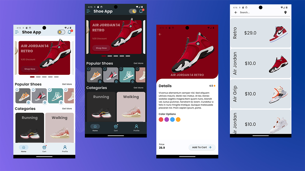 This documentation explains the usage and configuration of the shoe-themed Flutter application. The purpose of this application is to provide users with information and visual display of shoes. The GetX package is used for state management and navigation within the application.
