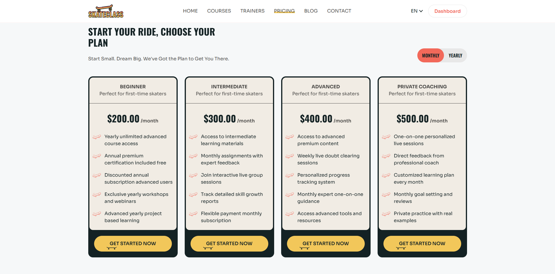 For learners seeking special or advanced training, SkateClass offers monthly and yearly subscription plans that unlock exclusive facilities and premium benefits. The system ensures smooth management of trainers, courses, enrollments, and subscriptions in one place.