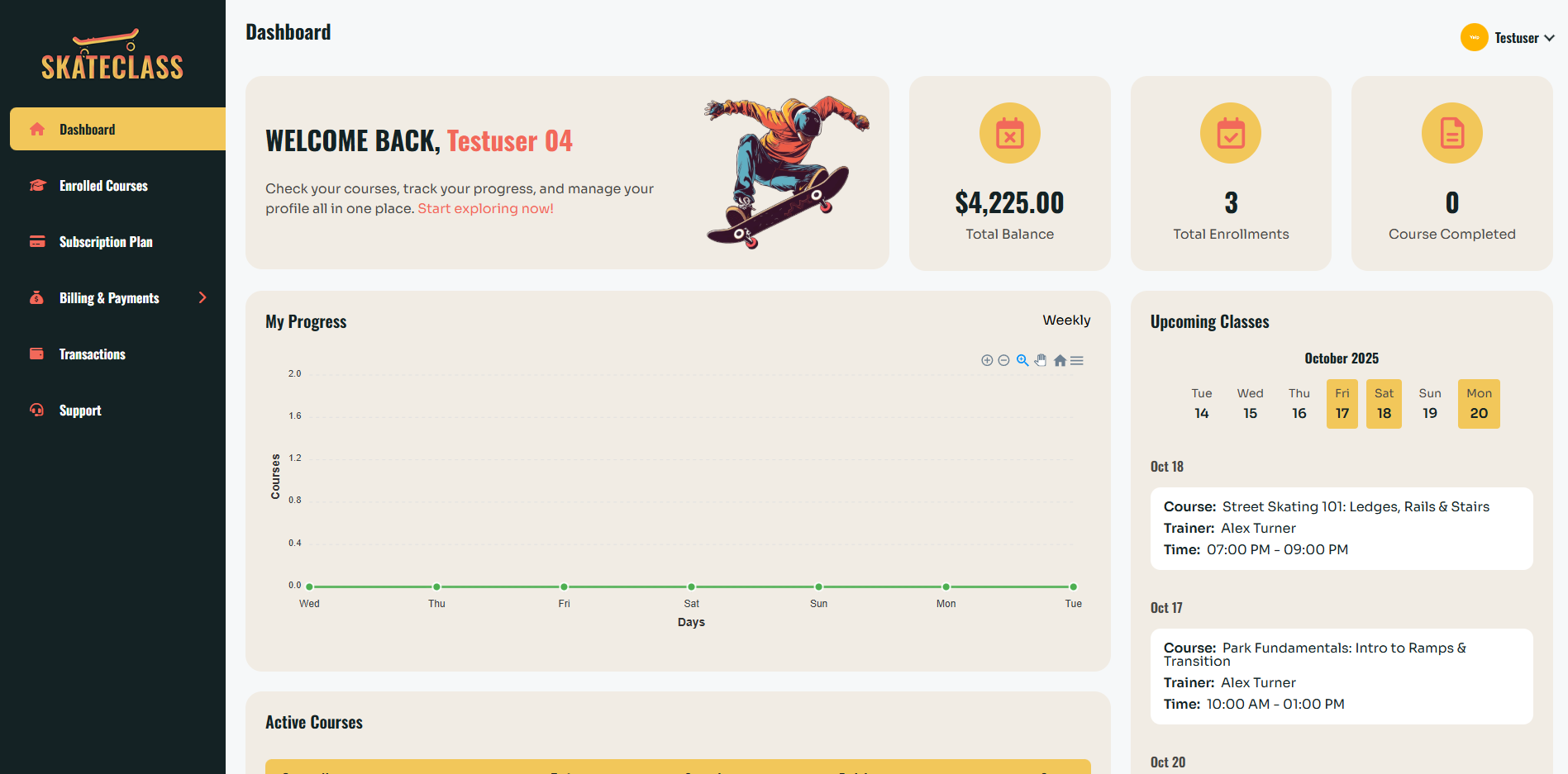 With a clean interface and user-friendly flow, SkateClass makes it easier for training centers to organize physical skate classes while giving students a modern online experience for enrollment and plan subscriptions.