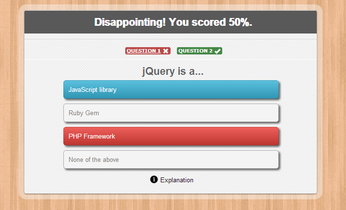 Sliding Quiz is a jQuery plugin that allows you easily create the multiple choice questions for many purposes, such as teaching, blogging, advertising and etc..