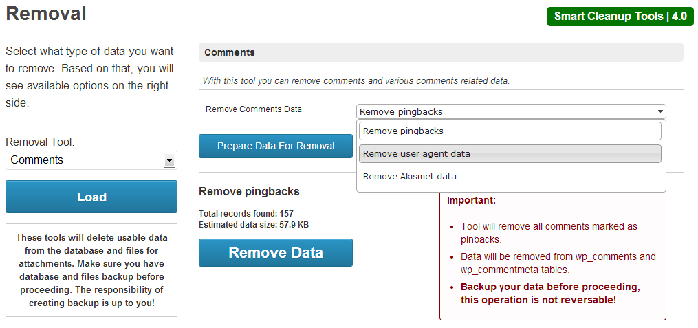 Smart Cleanup Tools is an easy-to-use, powerful plugin for database cleanup with total of 37 cleanup, reset and removal tools. With this plugin you can remove data that is no longer in use, or it is unneeded.